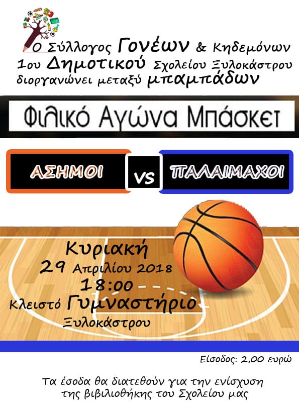 Την ερχόμενη Κυριακή 29/04 και ώρα 6 μμ. οι μπαμπάδες του 1ου Δημοτικού Σχολείου Ξυλοκάστρου παίζουν basket με στόχο να αναβαθμιστεί η βιβλιοθήκη του σχολείου μας.