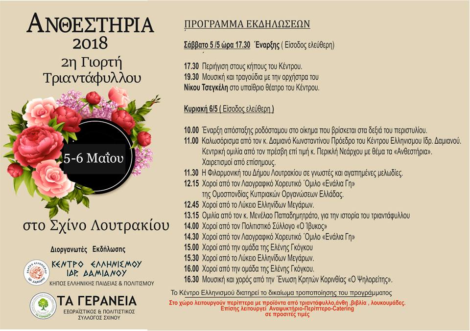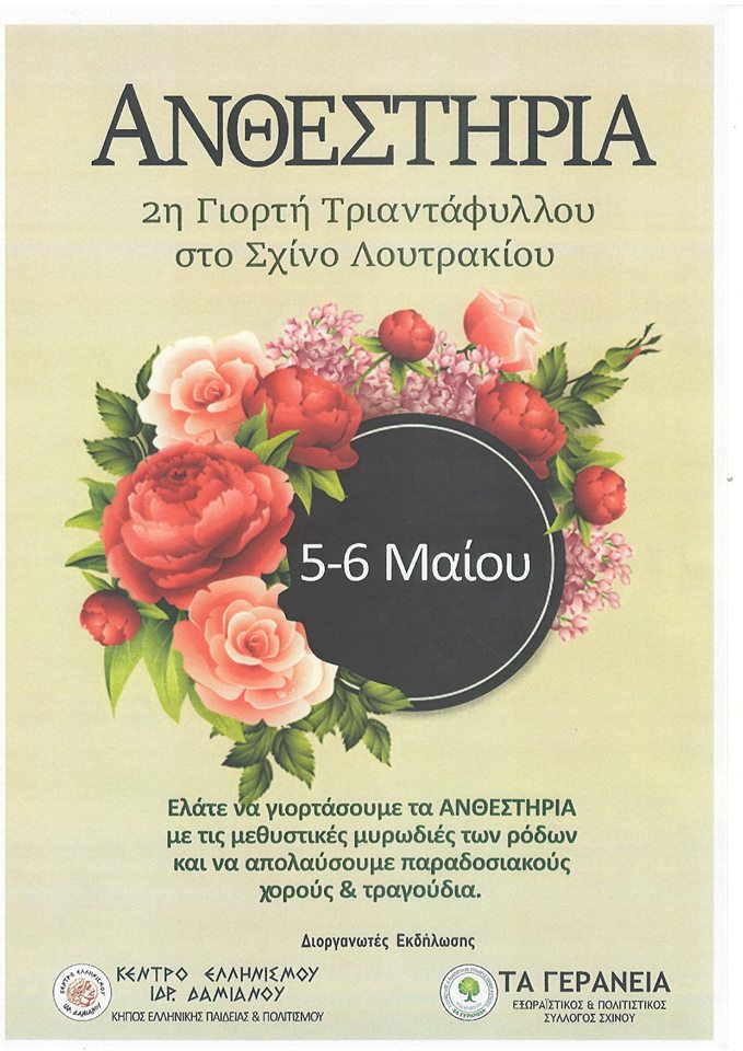 Μία αξιόλογη εκδήλωση για τη γιορτή του τριαντάφυλλου διοργανώνεται για δεύτερη συνεχόμενη χρονιά, στο Σχίνο Κορινθίας, από το Κέντρο Ελληνισμού Ιδρυμα Δαμιανού και τον εξωραιστικό-πολιτιστικό Σύλλογο “τα Γεράνεια”