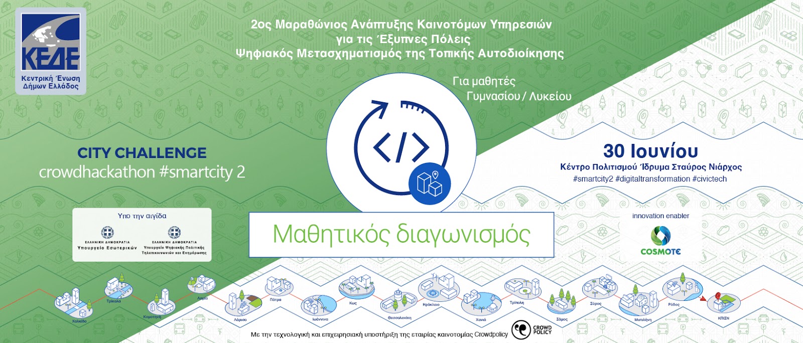 Στα πλαίσια του δεύτερου Μαραθωνίου Καινοτομίας City Challenge Crowdhackathon Smartcity 2 που διοργανώνει η Κεντρική Ένωση Δήμων Ελλάδαςαπό 28 Ιουνίου έως 1 Ιουλίου στο Κέντρο Πολιτισμού Ίδρυμα Σταύρος Νιάρχος διοργανώνεται Μαθητικός Διαγωνισμός Καινοτομίας για τις έξυπνες πόλεις.