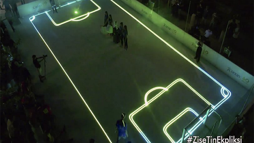 Ξαφνικά τα φώτα έσβησαν και ως διά μαγείας δέσμες λέιζερ άρχισαν να «ζωγραφίζουν» τη σέντρα, τη μικρή και μεγάλη περιοχή, τη βούλα του πέναλτι: μέσα σε λίγα λεπτά το πρώτο γήπεδο στην Ελλάδα με λέιζερ διαγράμμιση ήταν γεγονός!