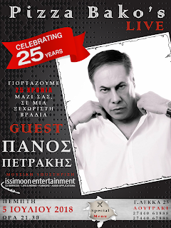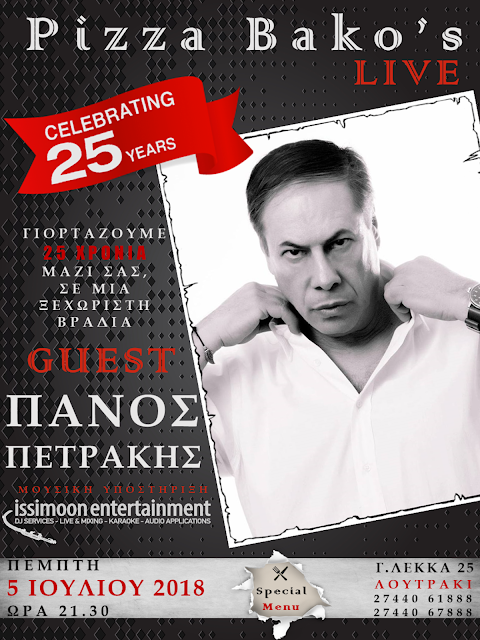 Η Pizza Bako’s γιορτάζει 25 χρόνια λειτουργίας !! Γιορτάζουμε μαζί σας σε μια ξεχωριστή βραδιά με QUEST τον μοναδικό Πάνο Πετράκη !!