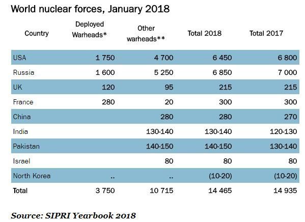 Αυτό, όπως υπογραμμίζεται στη σχετική ανακοίνωση, συνιστά μείωση σε σχέση με τις αρχές του 2017 (14.935), που οφείλεται κυρίως στο ότι η Ρωσία και οι ΗΠΑ (που έχουν μαζί το 92% του συνόλου των πυρηνικών όπλων στον πλανήτη) μείωσαν περαιτέρω τις στρατηγικές τους πυρηνικές δυνάμεις, στο πλαίσιο της εφαρμογής της νέας συνθήκης START το 2010.