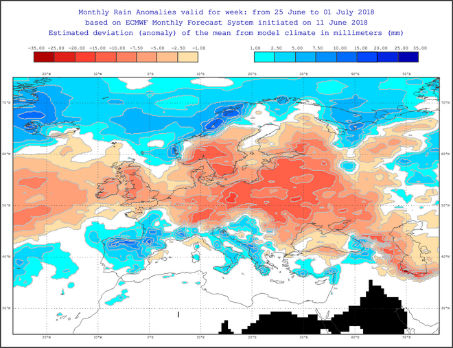 Με αξιόλογα ποσά βροχοπτώσεων θα φύγει ο φετινός Ιούνιος σύμφωνα με τα προγνωστικά στοιχεία του κλιματικού μοντέλου S5 του Ευρωπαικού Κέντρου Μεσοπρόθεσμων Προγνώσεων (ECMWF) . Το αξιόπιστο, πρόγραμμα της ΕΕ τρέχει στα πλαίσια του Copernicus και υποστηρίζει το EFFIS -European Forest Fire Information System , ένα σημαντικό σημαντικό “εργαλείο” για το έργο της Πυροσβεστικής και της Γενικής Γραμματείας Πολιτικής Προστασίας. Στον παραπάνω χάρτη μπορούμε να διακρίνουμε οτι στον κορμό της ηπειρωτικής Ελλάδος θα έχουμε τιμές βροχής κατά 5 με 10 mm πάνω από τον μέσο όρο.