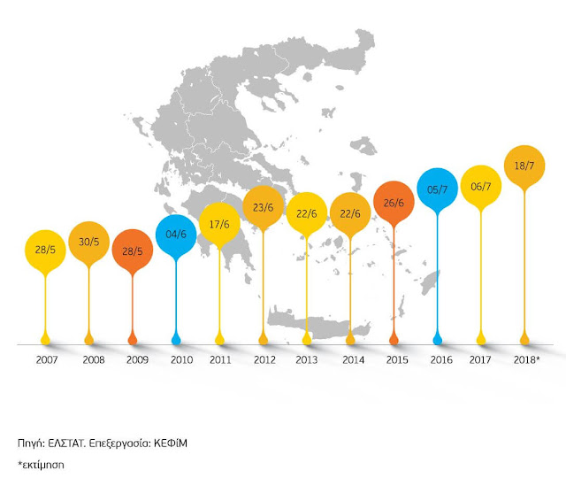 Όπως αναφέρει η μελέτη του ΚΕΦίμ η ημέρα Φορολογικής Ελευθερίας, δηλαδή η ημέρα από την οποία κάποιος σταματά να δουλεύει για την εφορία και ασφαλιστικά Ταμεία και όσα βγάζει είναι για τον εαυτό του, συνεχίζει να φτάνει κάθε χρόνο και αργότερα, απορροφώντας όλο και μεγαλύτερο μέρος των εισοδημάτων που παράγουν οι Έλληνες και οι Ελληνίδες.