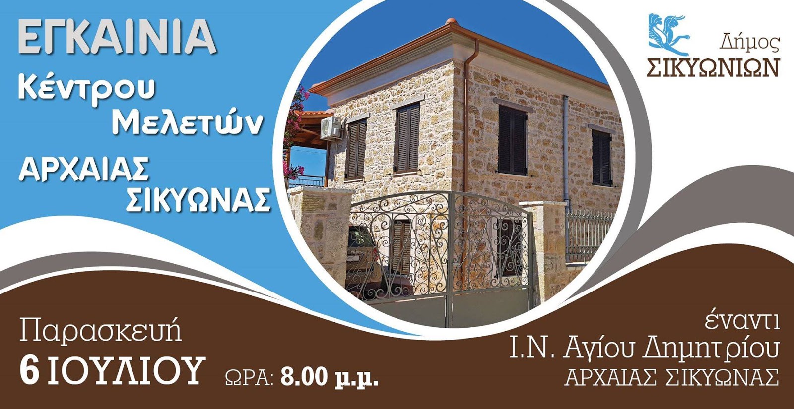 Ο Δήμος Σικυωνίων έχει την τιμή και τη χαρά να σας προσκαλέσει στα εγκαίνια του «Κέντρου Μελετών Αρχαίας Σικυώνας». Το “Κέντρο Μελετών” στεγάζεται σε κτήριο που παραχωρήθηκε με δωρεά από τους Άρη και Τατιάνα Αναστ. Λεονάρδου,