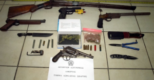 Επιπλέον, στο χώρο της φυτείας βρέθηκαν και κατασχέθηκαν, ένα (1) περίστροφο, πλήρες φυσιγγίων, ένα (1) στιλέτο, ένας (1) σουγιάς και δύο (2) φυσίγγια, ενώ σε έρευνα που πραγματοποιήθηκε στην οικία του, σε τοπική κοινότητα του Δήμου Σπάρτης Λακωνίας, βρέθηκαν συνολικά και επίσης κατασχέθηκαν,