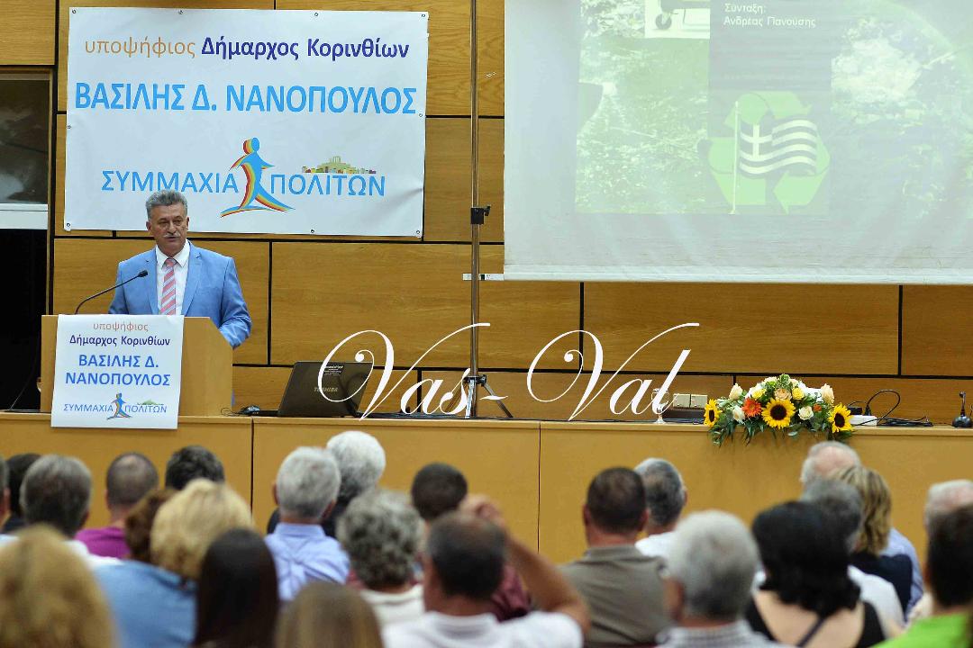 Τη Δευτέρα 17 Σεπτεμβρίου, στην κατάμεστη αίθουσα του Εργατικού Κέντρου Κορίνθου, ο επικεφαλής του συνδυασμού ΣΥΜΜΑΧΙΑ ΠΟΛΙΤΩΝ κ. Βασίλης Νανόπουλος, ξεκίνησε επίσημα την προεκλογική του εκστρατεία..