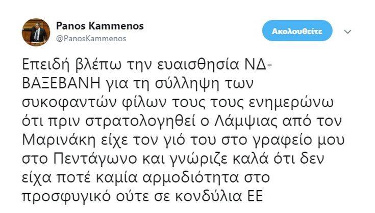 Συγκεκριμένα ο κ. Καμμένος έγραψε: «Επειδή βλέπω την ευαισθησία ΝΔ-Βαξεβάνη για τη σύλληψη των συκοφαντών φίλων τους, τους ενημερώνω ότι πριν στρατολογηθεί ο Λάμψιας από τον Μαρινάκη είχε τον γιο του στο γραφείο μου στο Πεντάγωνο και γνώριζε καλά ότι δεν είχα ποτέ καμία αρμοδιότητα στο προσφυγικό ούτε σε κονδύλια ΕΕ».