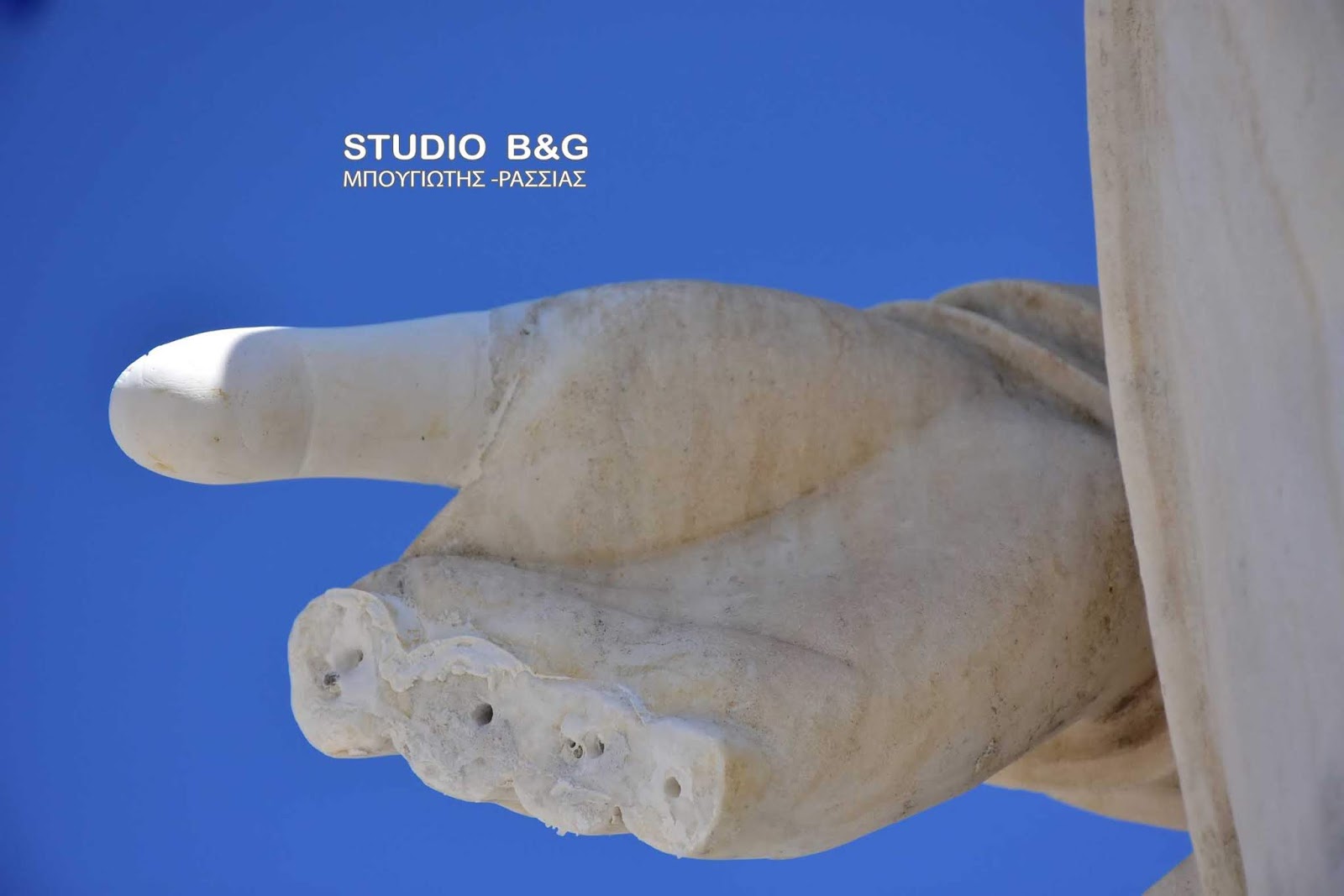Είναι έργο του μεγάλου γλύπτη Μιχάλη Τόμπρου. Το 1947, το δάκτυλο είχε σπάσει πρώτη φορά από ένα παιδί, ενώ για μια ακόμα φορά, έσπασε την δεκαετία του ’80. Τον Αύγουστο και πάλι άγνωστοι δράστες προξένησαν φθορές στο άγαλμα.