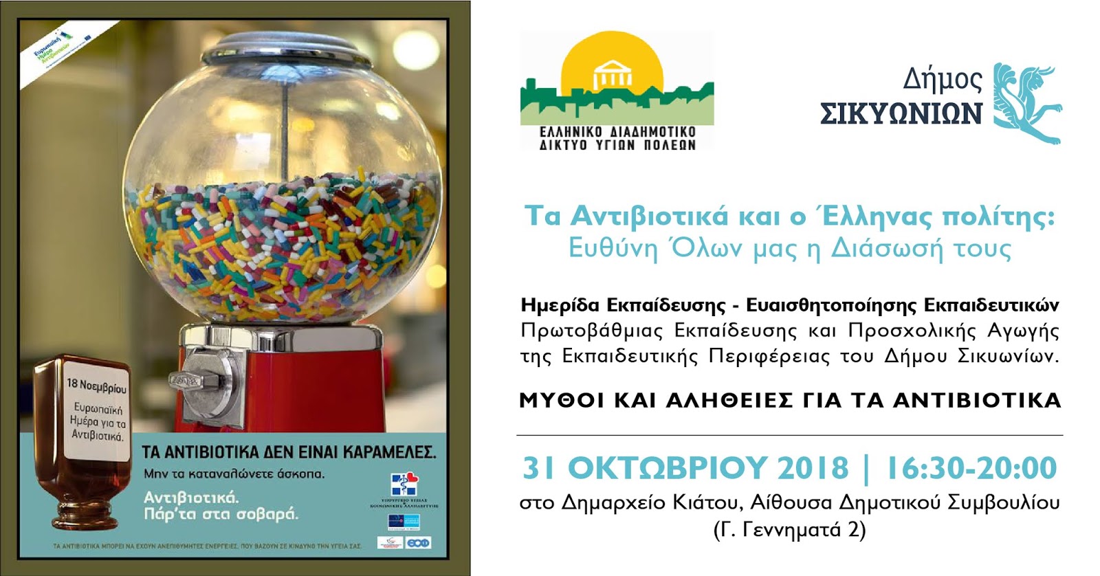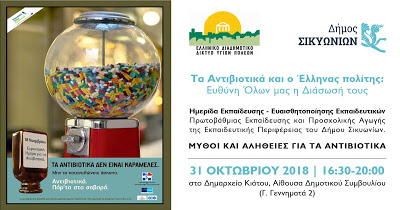 Ο Δήμος Σικυωνίων, μέλος του Ελληνικού Δικτύου Υγιών Πόλεων του Π.Ο.Υ., και το Ελληνικό Διαδημοτικό Δίκτυο Υγιών Πόλεων διοργανώνουν, στο πλαίσιο της Πανελλήνιας Εκστρατείας ευαισθητοποίησης και ενημέρωσης του πληθυσμού για την ορθή χρήση των αντιβιοτικών…