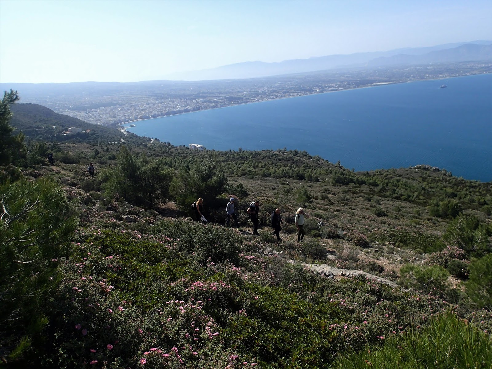Από εδώ η θέα προς Πελοπόννησο είναι καταπληκτική. Μπορούμε να δούμε μέχρι και τα βουνά της Τρίπολης, ενώ στα πόδια μας απλώνεται ο Κορινθιακός κόλπος.