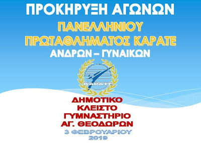 Η Ελληνική ομοσπονδία Καράτε διοργανώνει τη Κυριακή 3 Φεβρουαρίου 2019 στο κλειστό γυμναστήριο των Αγίων Θεοδώρων το Πανελλήνιο Πρωτάθλημα Καράτε.