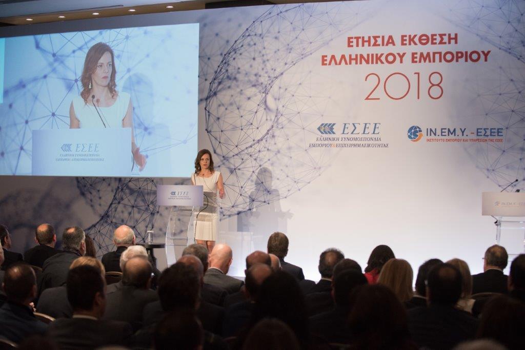 Η Ελληνική Συνομοσπονδία Εμπορίου και Επιχειρηματικότητας (ΕΣΕΕ) παρουσίασε το Σάββατο 23-2-2019, την Ετήσια Έκθεση Ελληνικού Εμπορίου για το 2018. Την εκδήλωση τίμησαν με την παρουσία τους και απηύθυναν χαιρετισμό η Υπουργός Εργασίας, Κοινωνικής Ασφάλισης και Κοινωνικής Αλληλεγγύης κα Έφη Αχτσιόγλου και η βουλευτής της ΝΔ Α’ Αθηνών κα Όλγα Κεφαλογιάννη. Παραβρέθηκαν βουλευτές, πρόεδροι κοινωνικών εταίρων και επιμελητηρίων καθώς και εκατοντάδες εκπρόσωποι του εμπορικού κόσμου από όλη την Ελλάδα. Την εκδήλωση συντόνισε η δημοσιογράφος Μαρία Σαράφογλου.