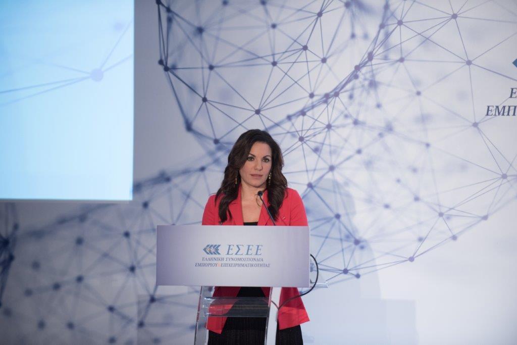 Η βουλευτής της ΝΔ κα Όλγα Κεφαλογιάννη, εκπροσωπώντας τον Πρόεδρο της ΝΔ Κυριάκο Μητσοτάκη, σημείωσε τη συμβολή της ΕΣΕΕ στην ανάπτυξη της επιχειρηματικότητας στη χώρα, ενώ υπογράμμισε την ανάγκη «η Ελλάδα να απαλλαγεί από τη στρεβλή φορολογική και ασφαλιστική πολιτική, που ουσιαστικά εκμηδενίζει τους κόπους των μικρομεσαίων επιχειρήσεων».