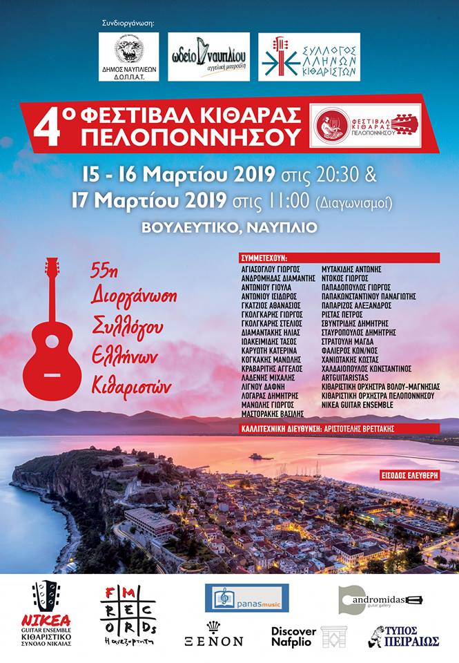 Το τριήμερο 15-17 Μαρτίου 2019 στο Ναύπλιο θα διεξαχθεί και φέτος το 4ο Φεστιβάλ Κιθάρας Πελοποννήσου.