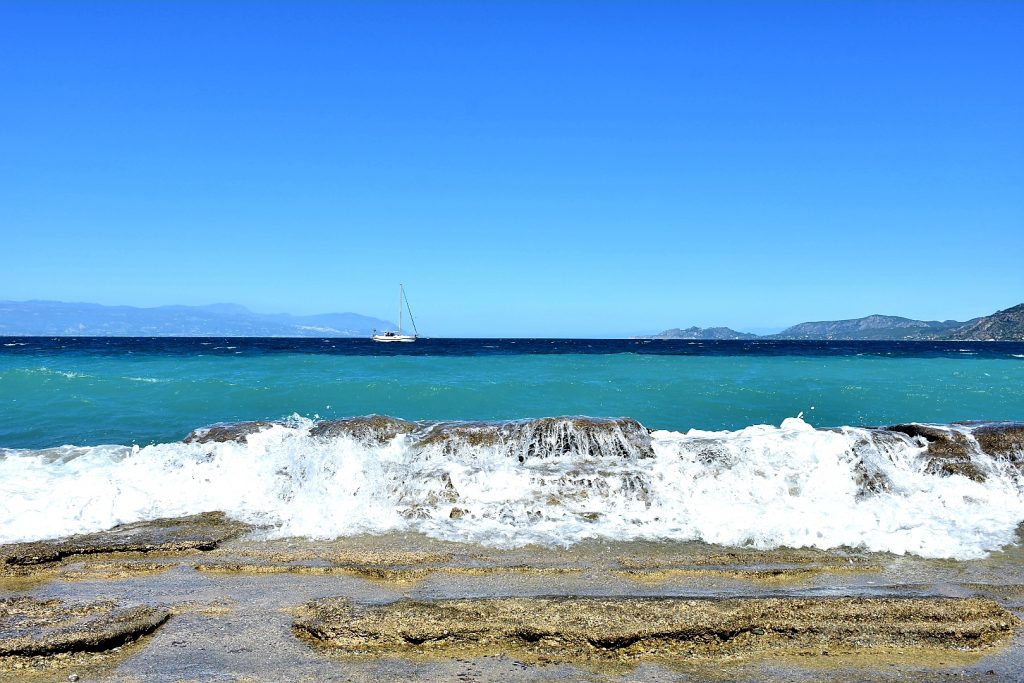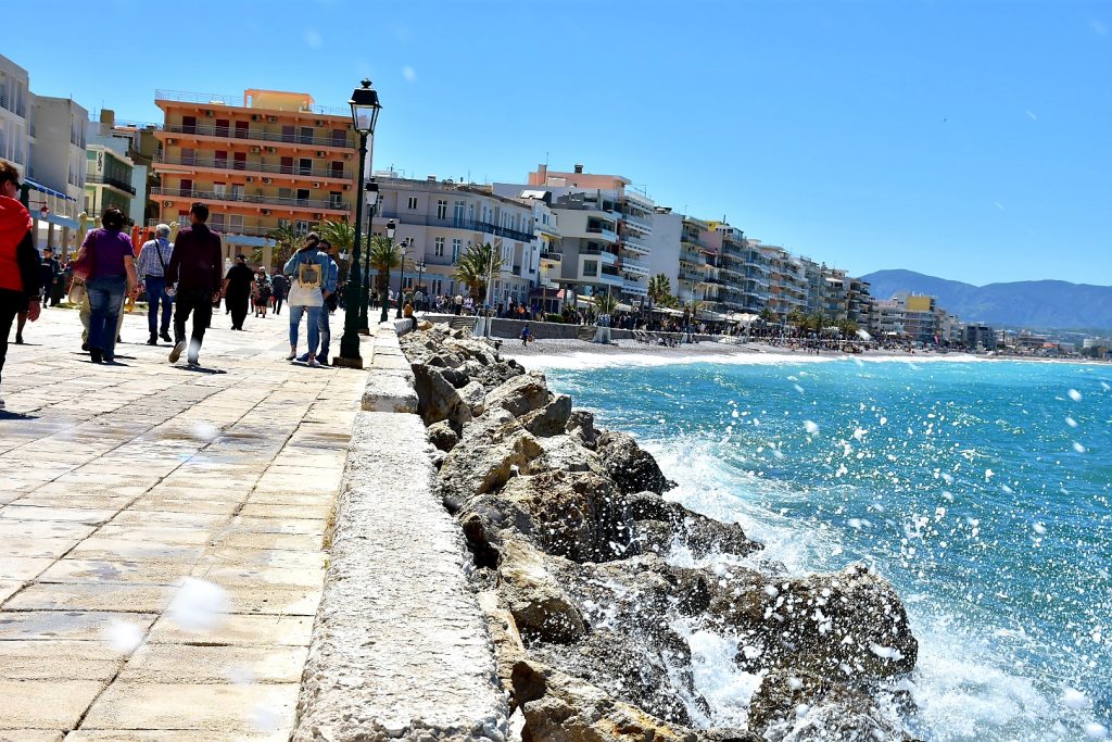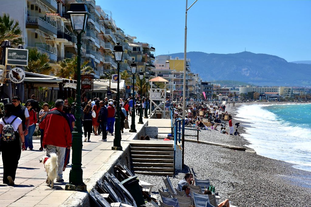 Γαλήνια θάλασσα μέσα στην άπνοια και την κατανυκτική ατμόσφαιρα της Μεγάλης Παρασκευής, μέχρι τα γνωστά εξωτικά μας κύματα σε μία κατάμεστη παραλία την Δευτέρα του Πάσχα.
