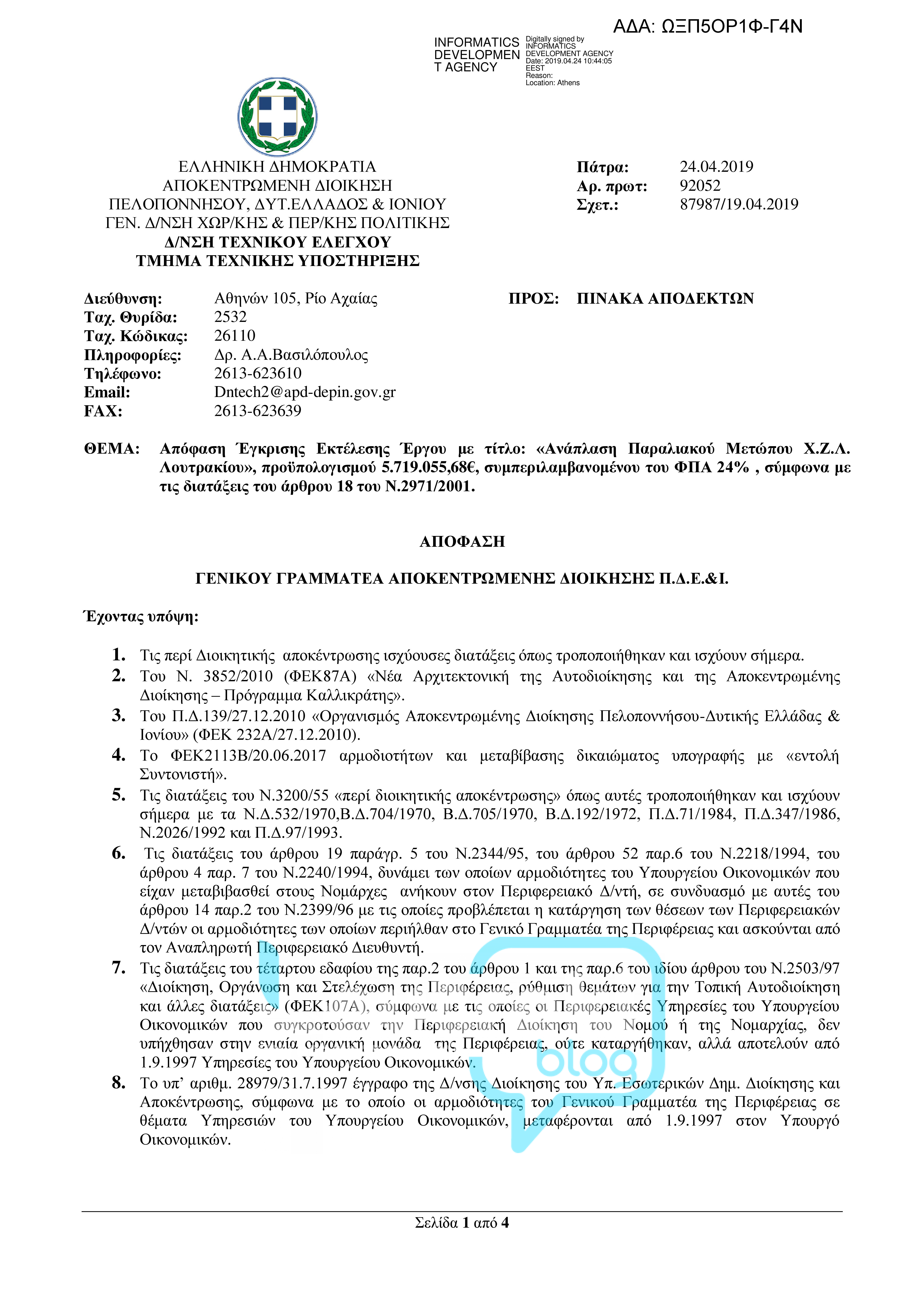 Εγκριση από την Αποκεντρωμένη Διοίκηση Πελοποννήσου