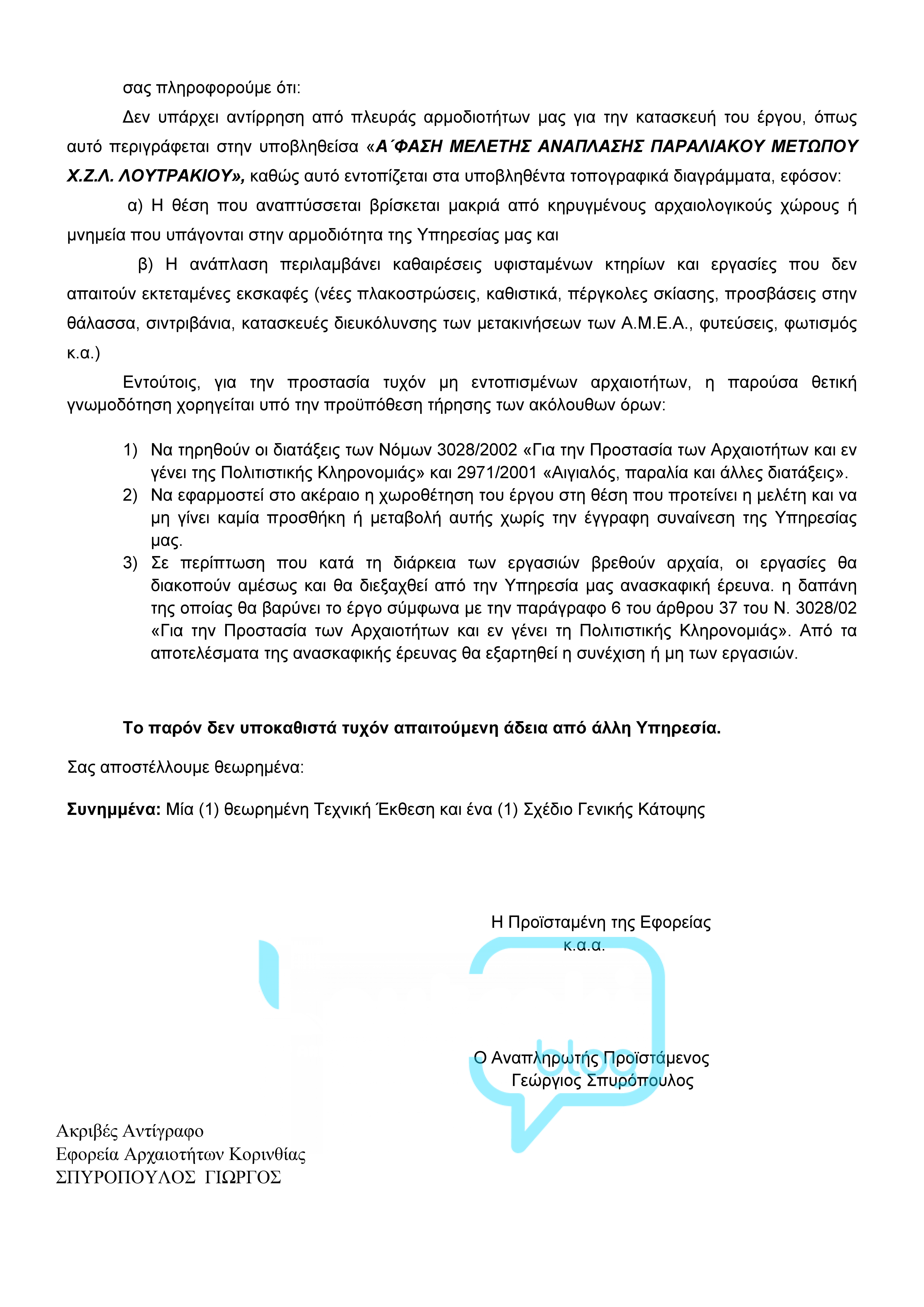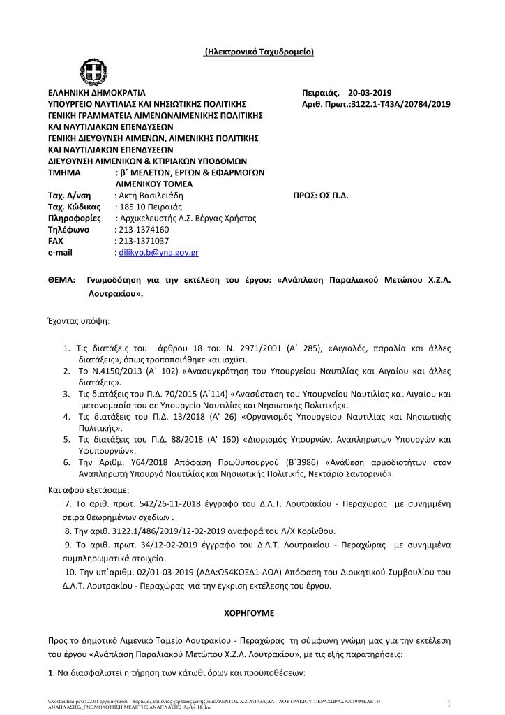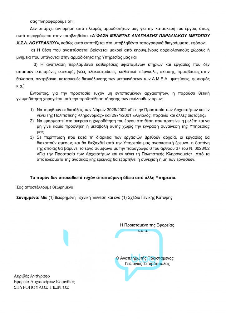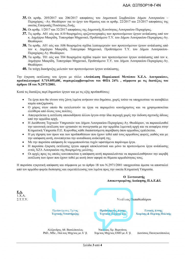Μετά το συκοφαντικό δημοσίευμα σε τοπικό blog του κ. Αθανάσιου Μουζάκη σχετικά με το θέμα της ανάπλασης του παραλιακού μετώπου που συζητήθηκε στη πρόσφατη συνεδρίαση του Δ.Σ. του Λιμενικού Ταμείου, σας παραθέτουμε όλες τις εγκρίσεις που απαιτούνταν και έχουν ληφθεί για την εκτέλεση του έργου και τις οποίες εγώ ο ίδιος προσωπικά παρέδωσα στο κ. Μουζάκη κατά τη διάρκεια της συνεδρίασης, παρουσία επαγγελματιών και πολιτών που παρίσταντο.