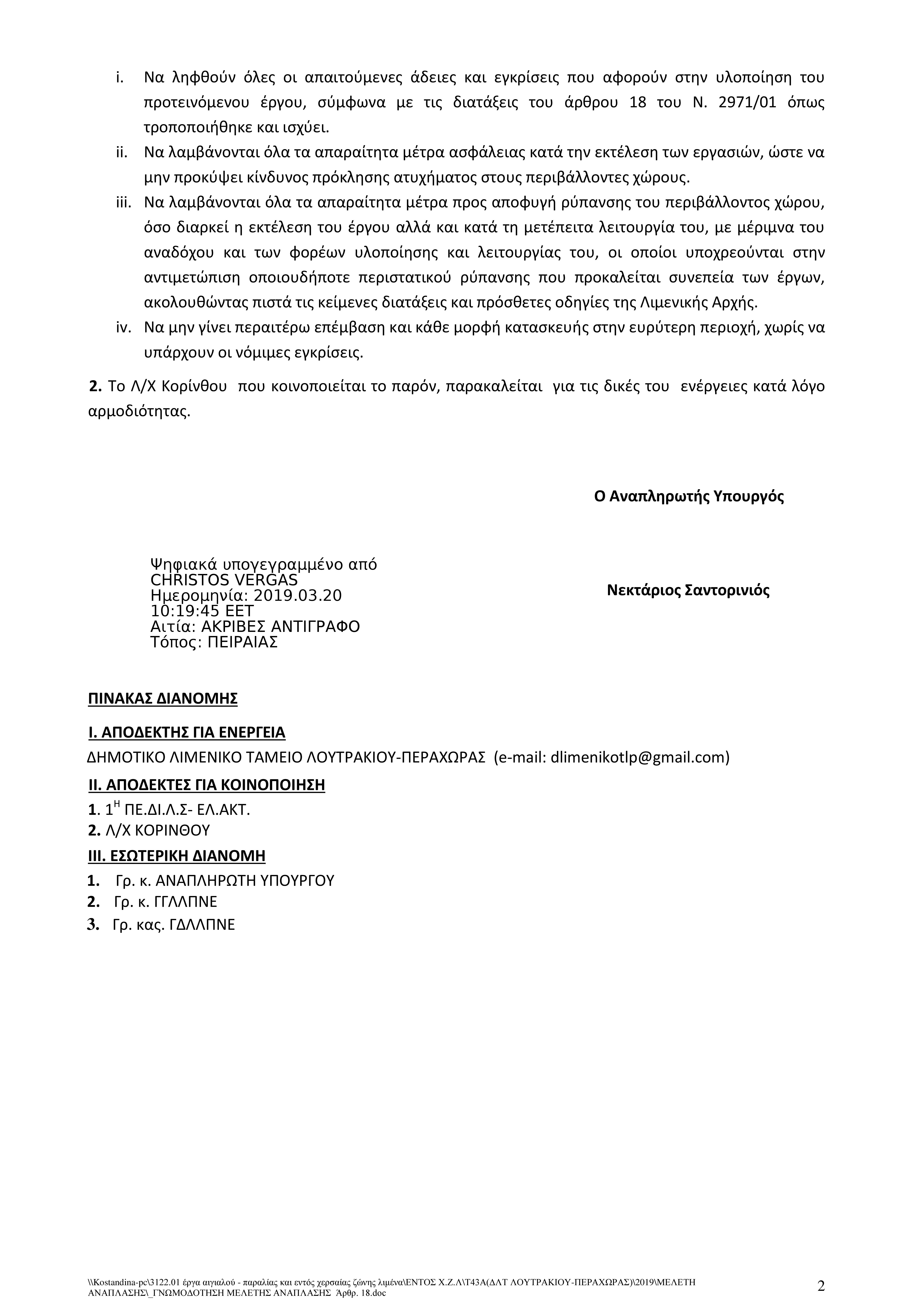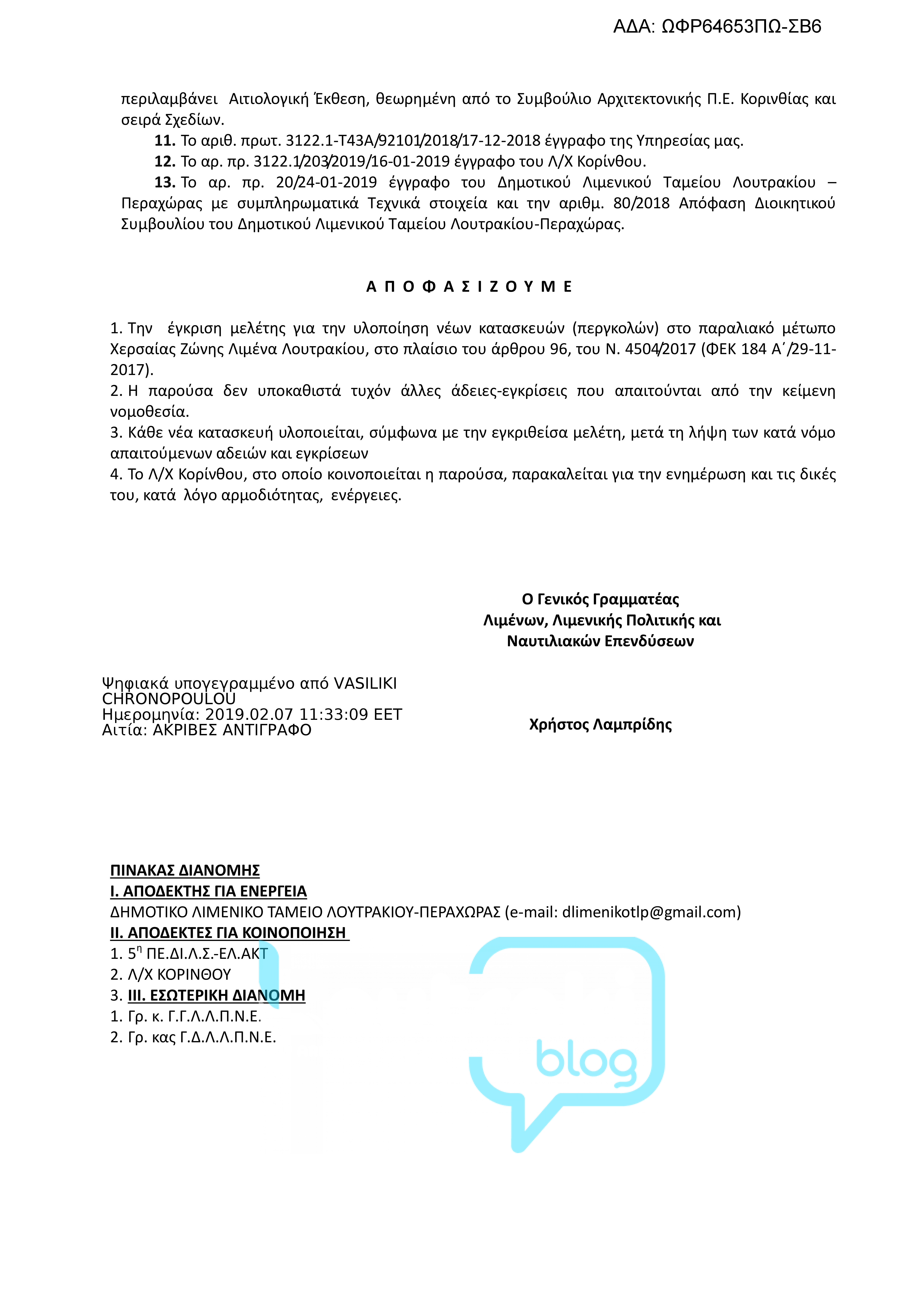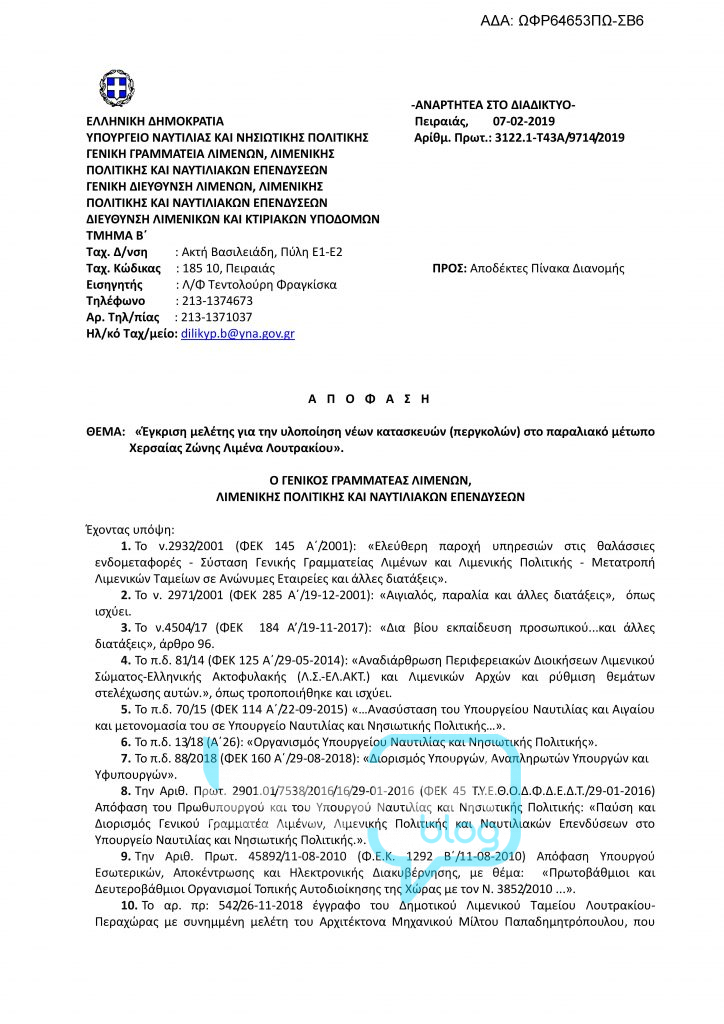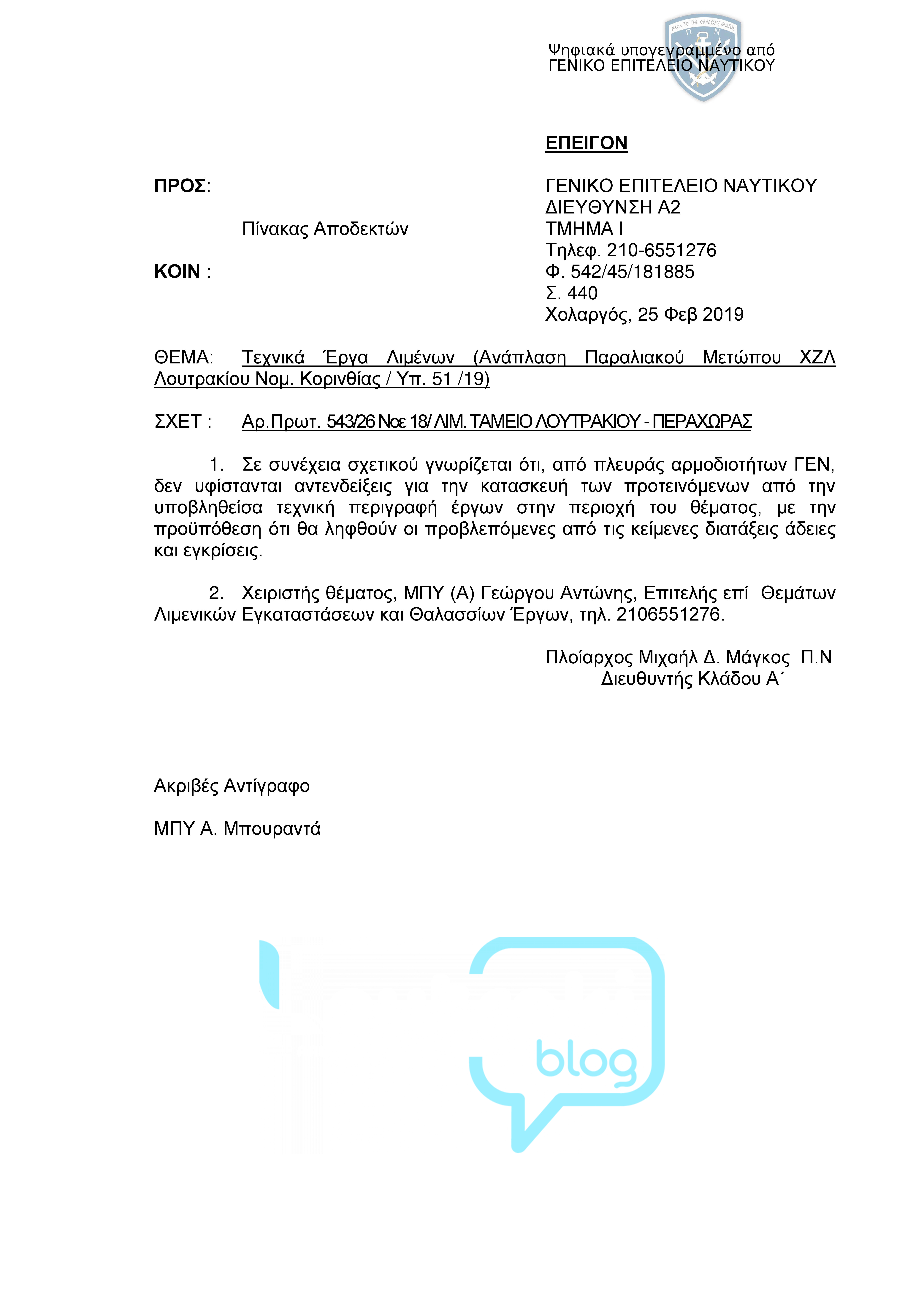 Μετά το συκοφαντικό δημοσίευμα σε τοπικό blog του κ. Αθανάσιου Μουζάκη σχετικά με το θέμα της ανάπλασης του παραλιακού μετώπου που συζητήθηκε στη πρόσφατη συνεδρίαση του Δ.Σ. του Λιμενικού Ταμείου, σας παραθέτουμε όλες τις εγκρίσεις που απαιτούνταν και έχουν ληφθεί για την εκτέλεση του έργου και τις οποίες εγώ ο ίδιος προσωπικά παρέδωσα στο κ. Μουζάκη κατά τη διάρκεια της συνεδρίασης, παρουσία επαγγελματιών και πολιτών που παρίσταντο.