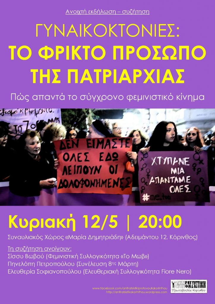 Σας καλούμε λοιπόν αυτή την Κυριακή 12/5 στις 20:00, στο συναυλιακό χώρο «Μαρία Δημητριάδη» (Αδειμάντου 12, Κόρινθος), σε μια ανοιχτή συζήτηση με θέμα «Γυναικοκτονίες: Το φρικτό πρόσωπο της πατριαρχίας. Πώς απαντά το σύγχρονο φεμινιστικό κίνημα». Μαζί μας θα είναι η Σίσσυ Βωβού (φεμινιστική συλλογικότητα «Το Μωβ»), η Πηνελόπη Πετροπούλου (Συνέλευση 8ης Μάρτη) και η Ελευθερία Σοφιανοπούλου (ελευθεριακή συλλογικότητα «Fiore Nero»). Μας αφορά όλες και όλους!