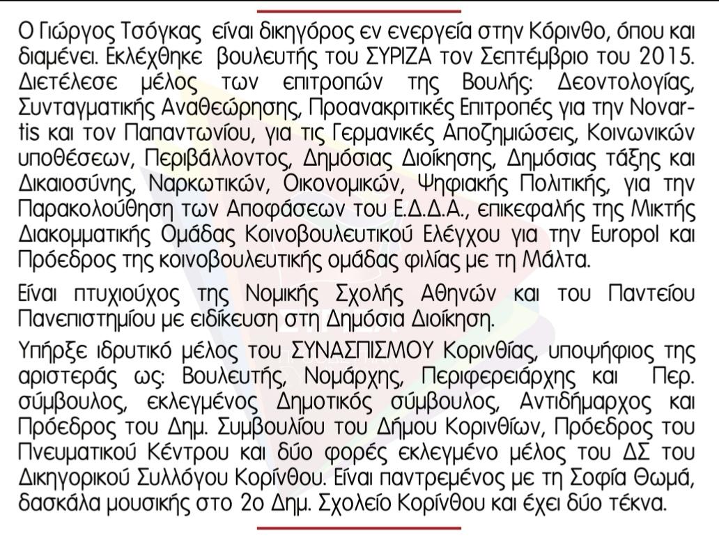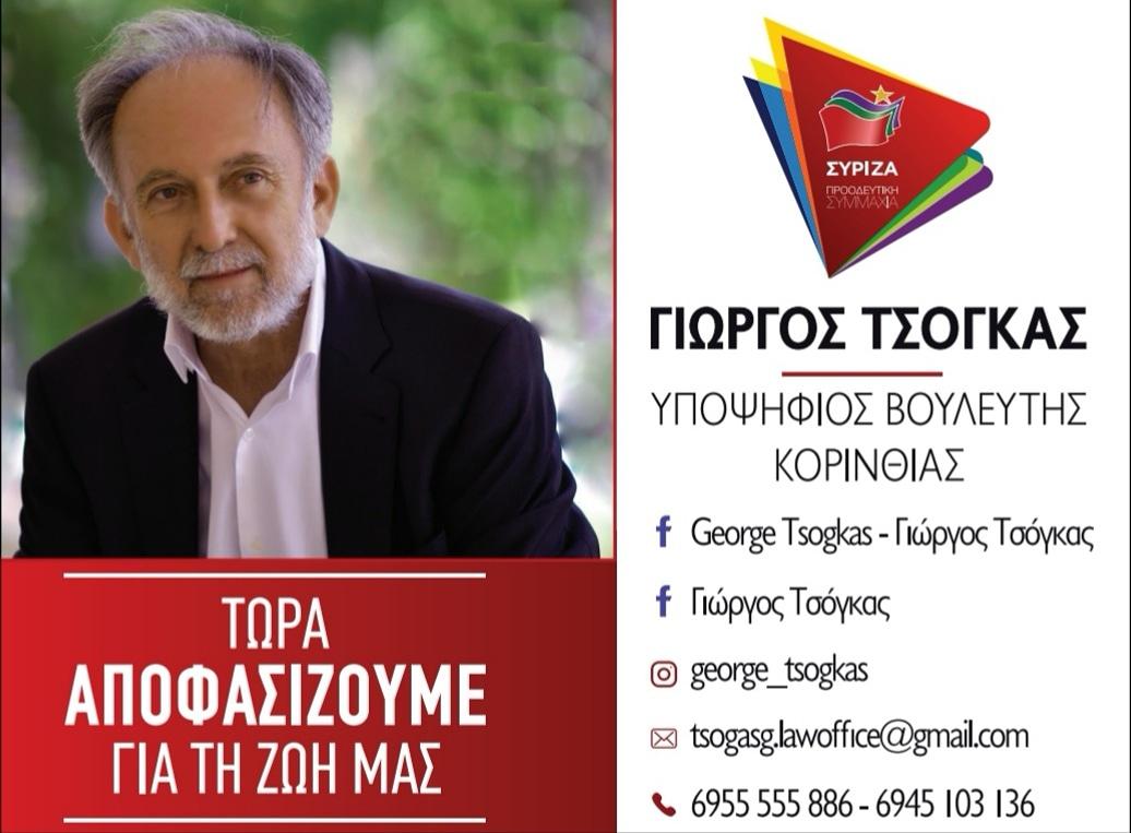 O Γιώργος Τσόγκας γεννήθηκε το έτος 1956 στη Κόρινθο, όπου και διαμένει. Είναι πτυχιούχος της Νομικής Σχολής Αθηνών και του Παντείου Πανεπιστημίου με ειδίκευση στη δημόσια διοίκηση. Ασκεί στην Κόρινθο το επάγγελμα του Δικηγόρου. Εξελέγη βουλευτής Κορινθίας με το ΣΥΡΙΖΑ στις εκλογές της 20ης Σεπτεμβρίου 2015 και έχει συμμετάσχει στις κάτωθι επιτροπές της Βουλής: