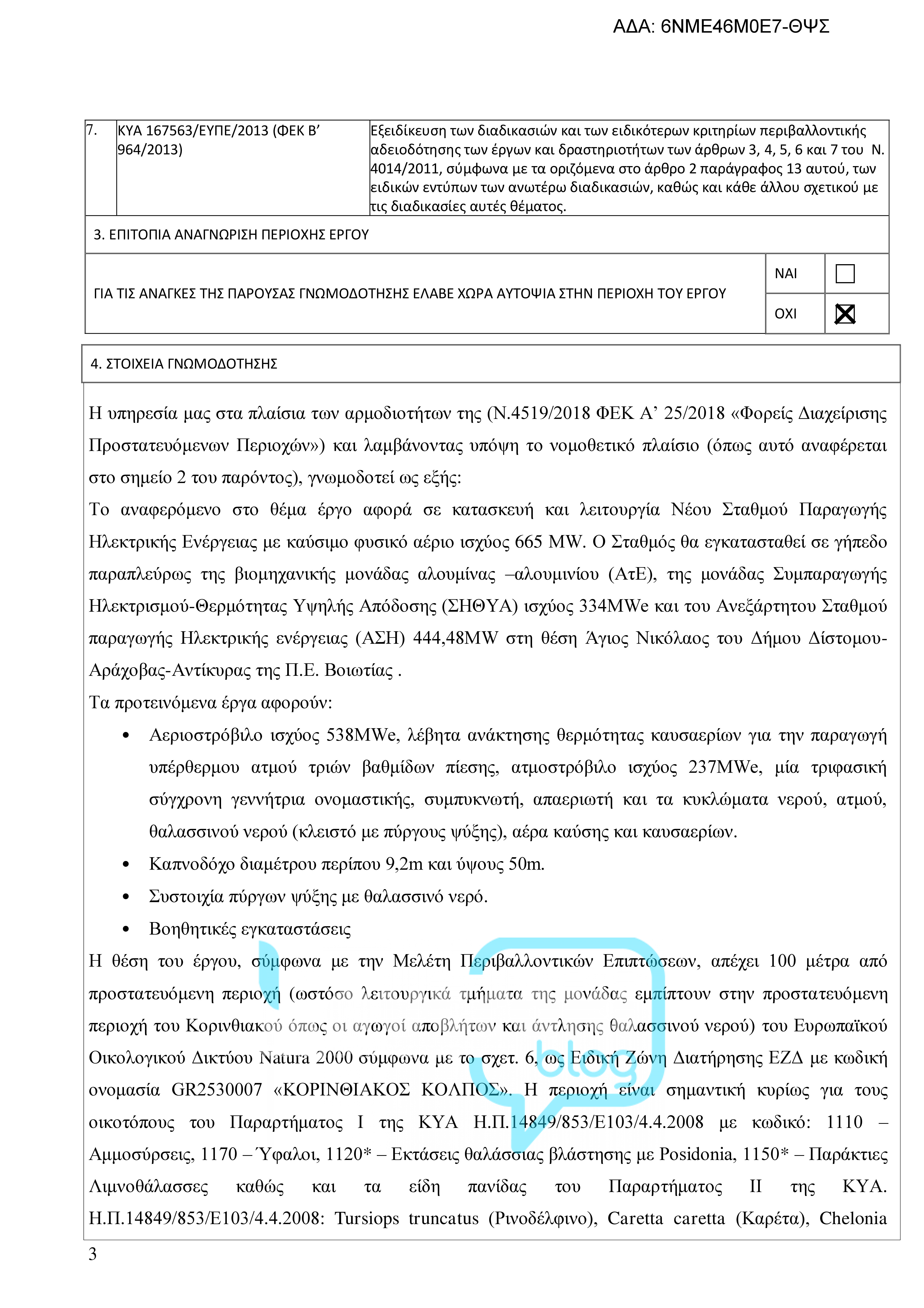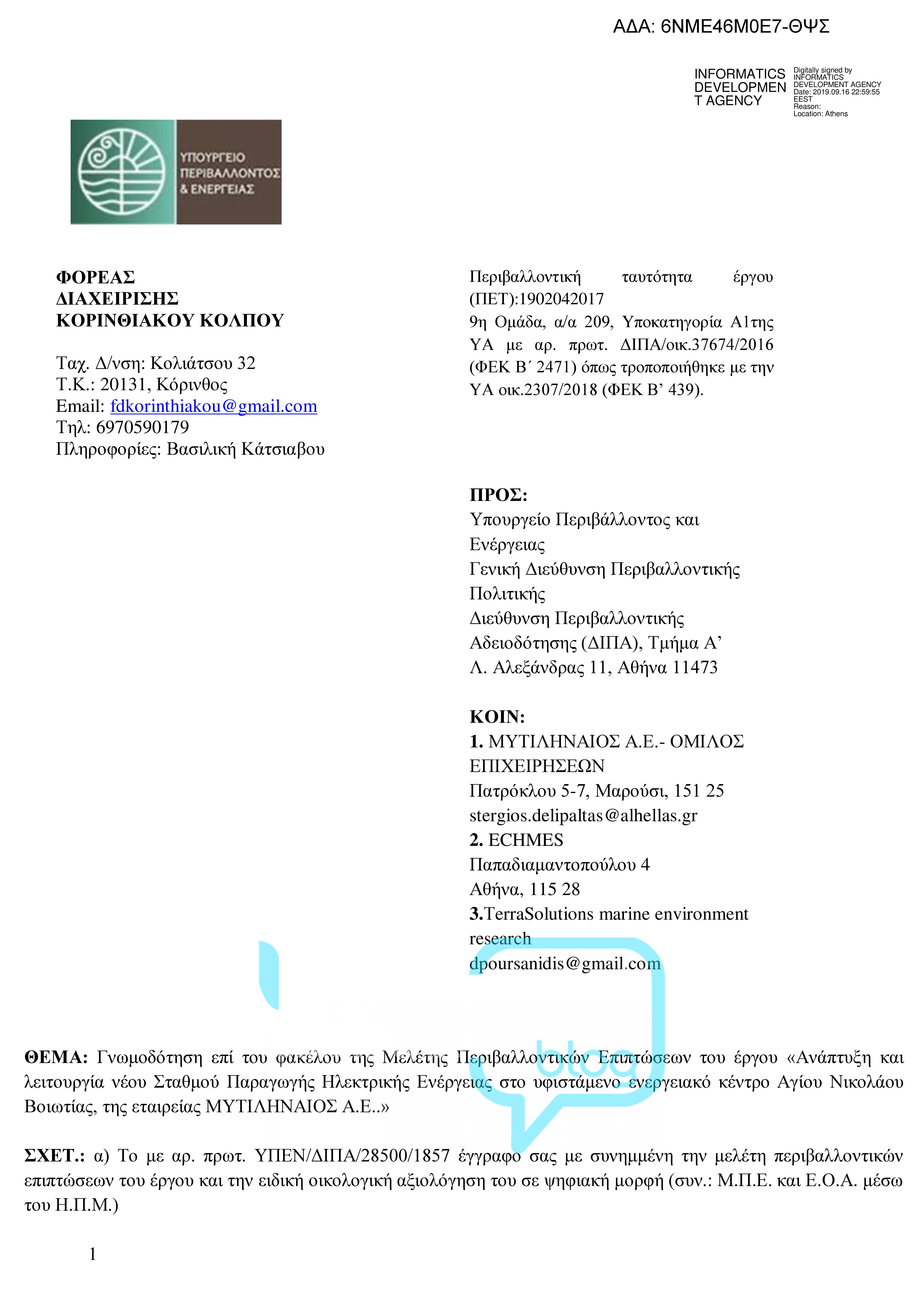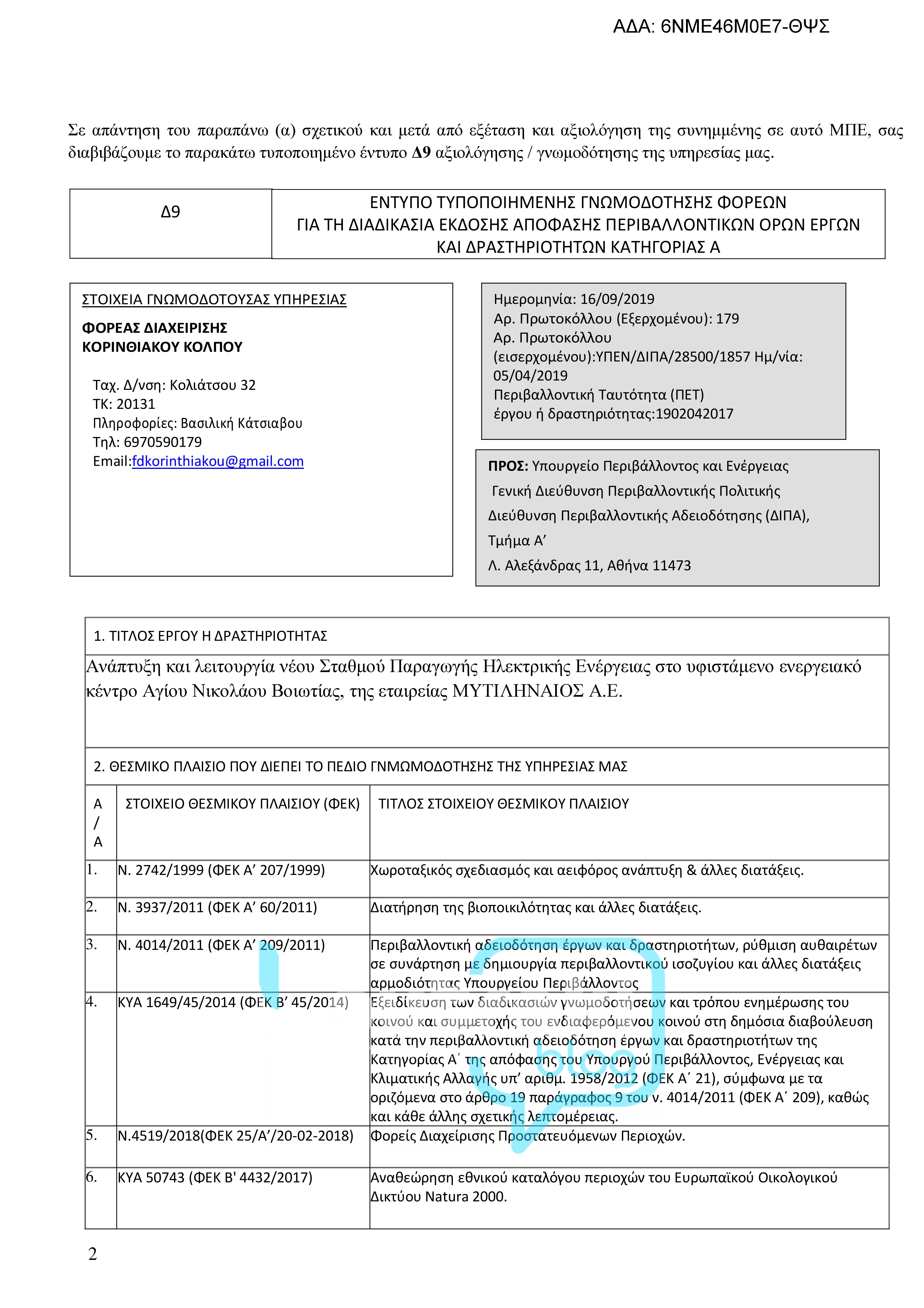 Αναρτήθηκε στη ΔΙΑΥΓΕΙΑ (του Υπουργείου Διοικητικής Ανασυγκρότησης),στις 16 Σεπτεμβρίου 2019, η γνωμοδότηση του φορέα διαχείρισης Κορινθιακού Κόλπου για το νέο εργοστάσιο παραγωγής ηλεκτρικής ενέργειας με φυσικό αέριο στη Βοιωτία και συγκεκριμένα στο υφιστάμενο ενεργειακό κέντρο Αγίου Νικολάου Βοιωτίας, της εταιρείας MYTΙΛΗΝΑΙΟΣ Α.Ε .