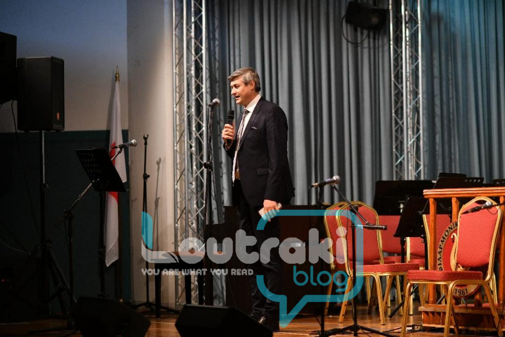 Η βραδιά ξεκίνησε με χαιρετισμούς από τον οικοδεσπότη Δήμαρχο Λουτρακίου Γεώργιο Γκιώνη, τον Πρόεδρο του Τμήματος Λουτρακίου Πέτρο Οικονόμου και τον Πρόεδρο της Κεντρικής Διοίκησης του Ερυθρού Σταυρού Αντώνιο Αυγερινό ο οποίος αναφέρθηκε επίσης στην ιστορία και στις σύγχρονες δράσεις του Οργανισμού.