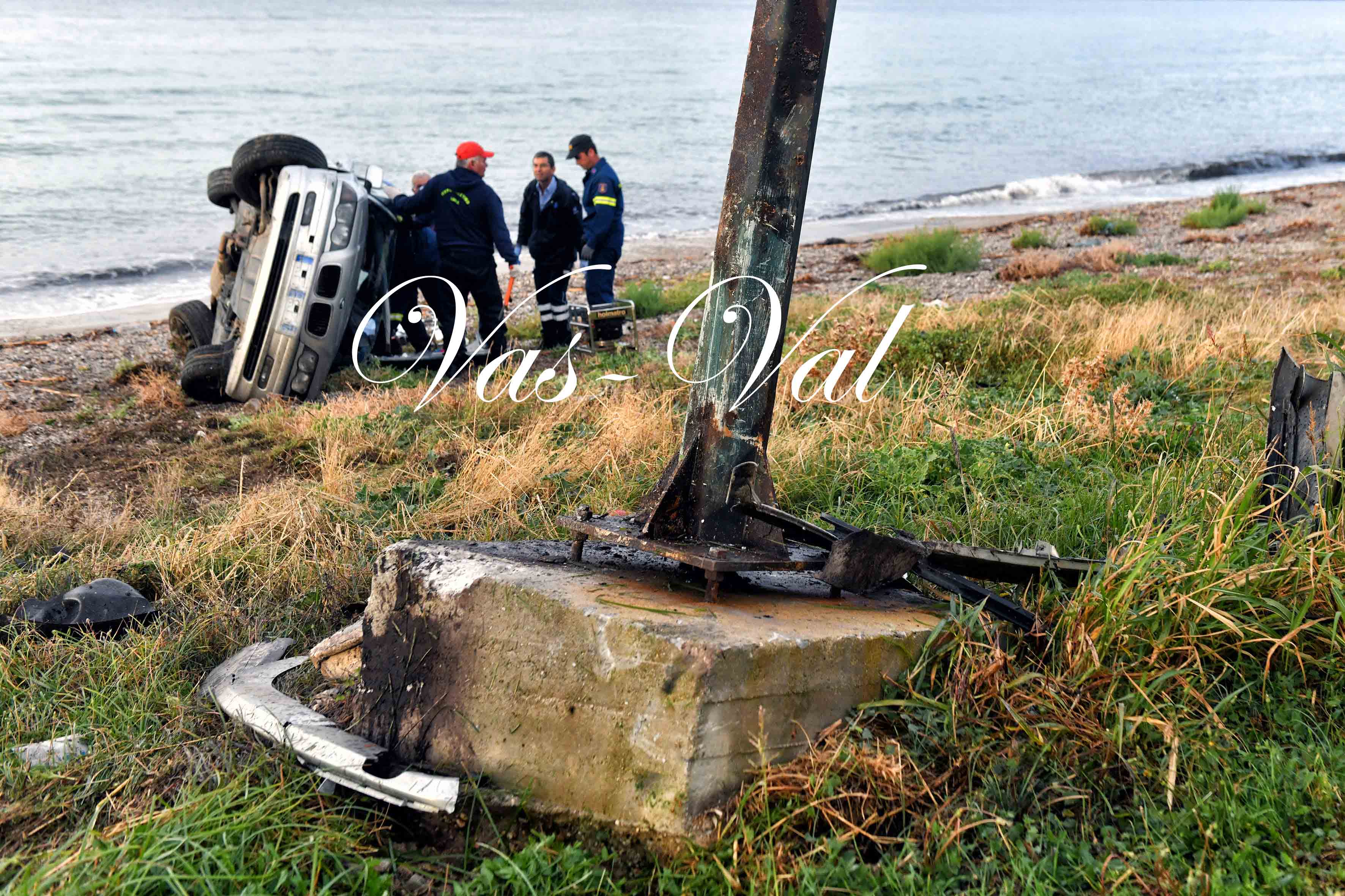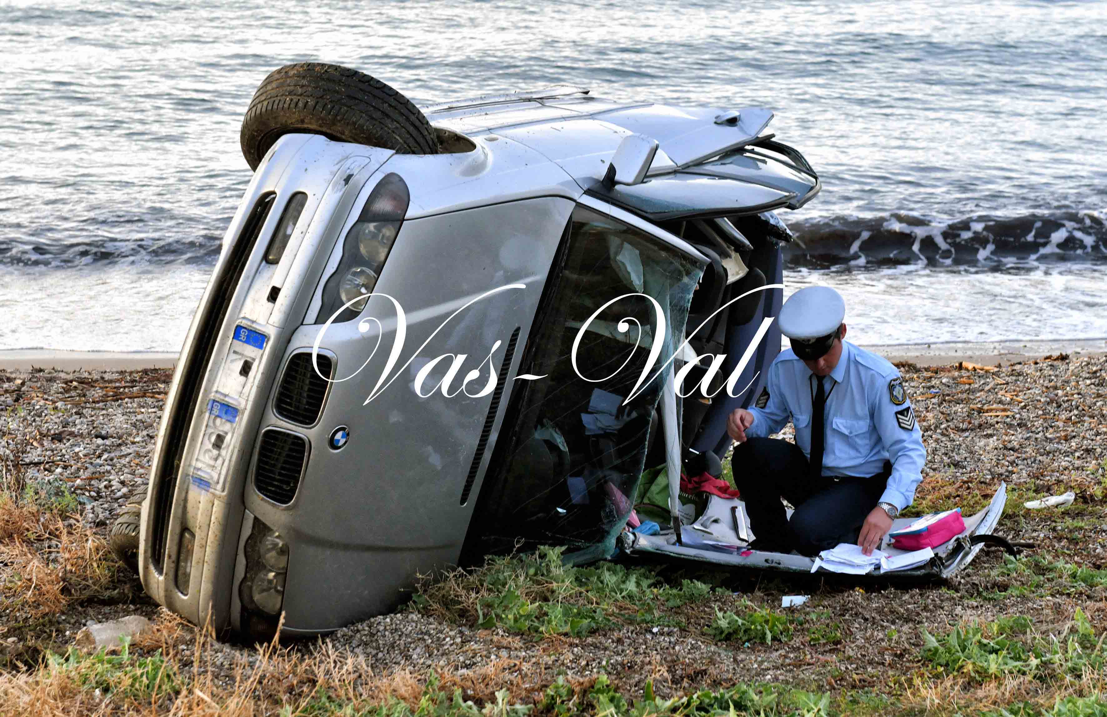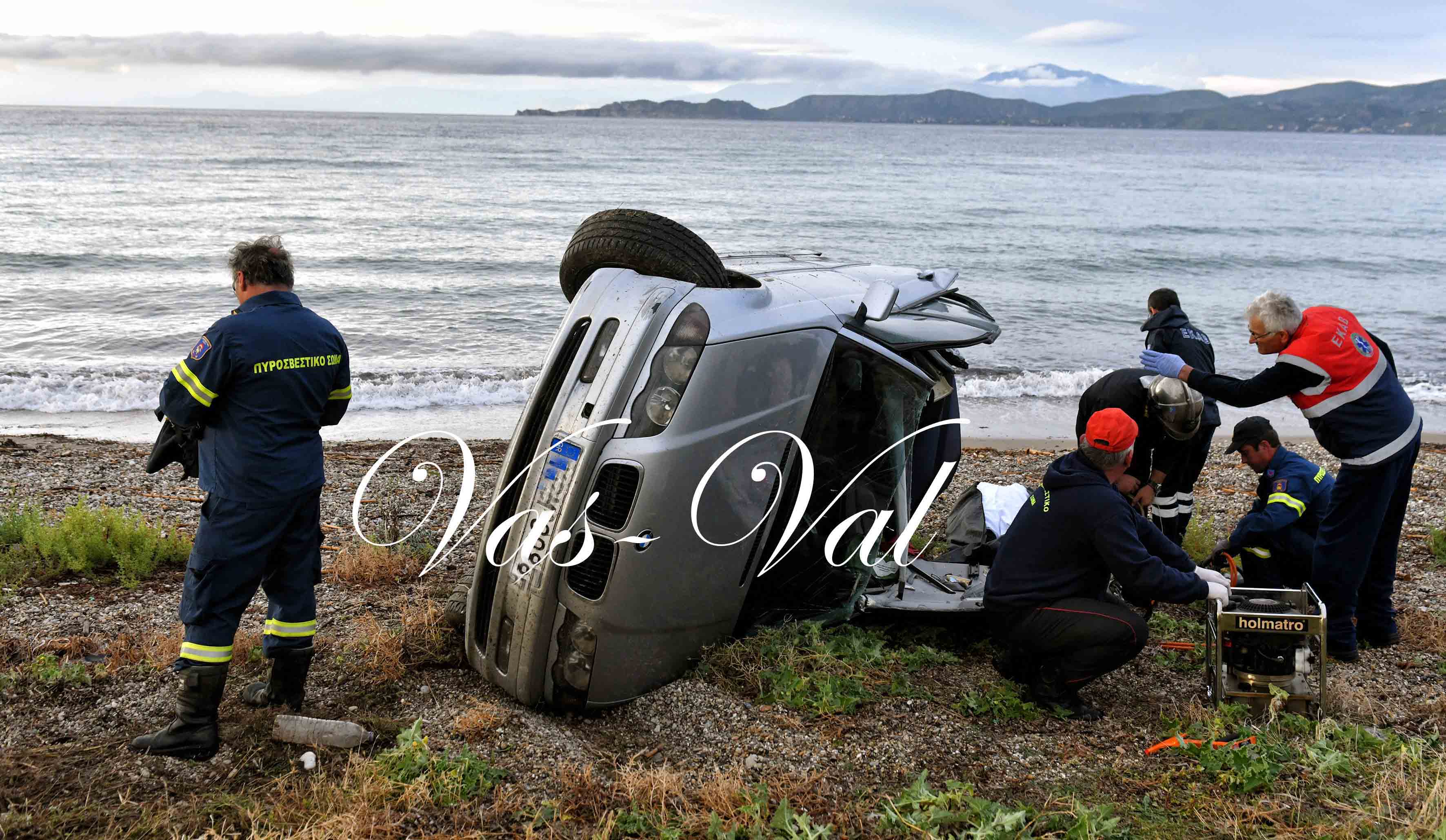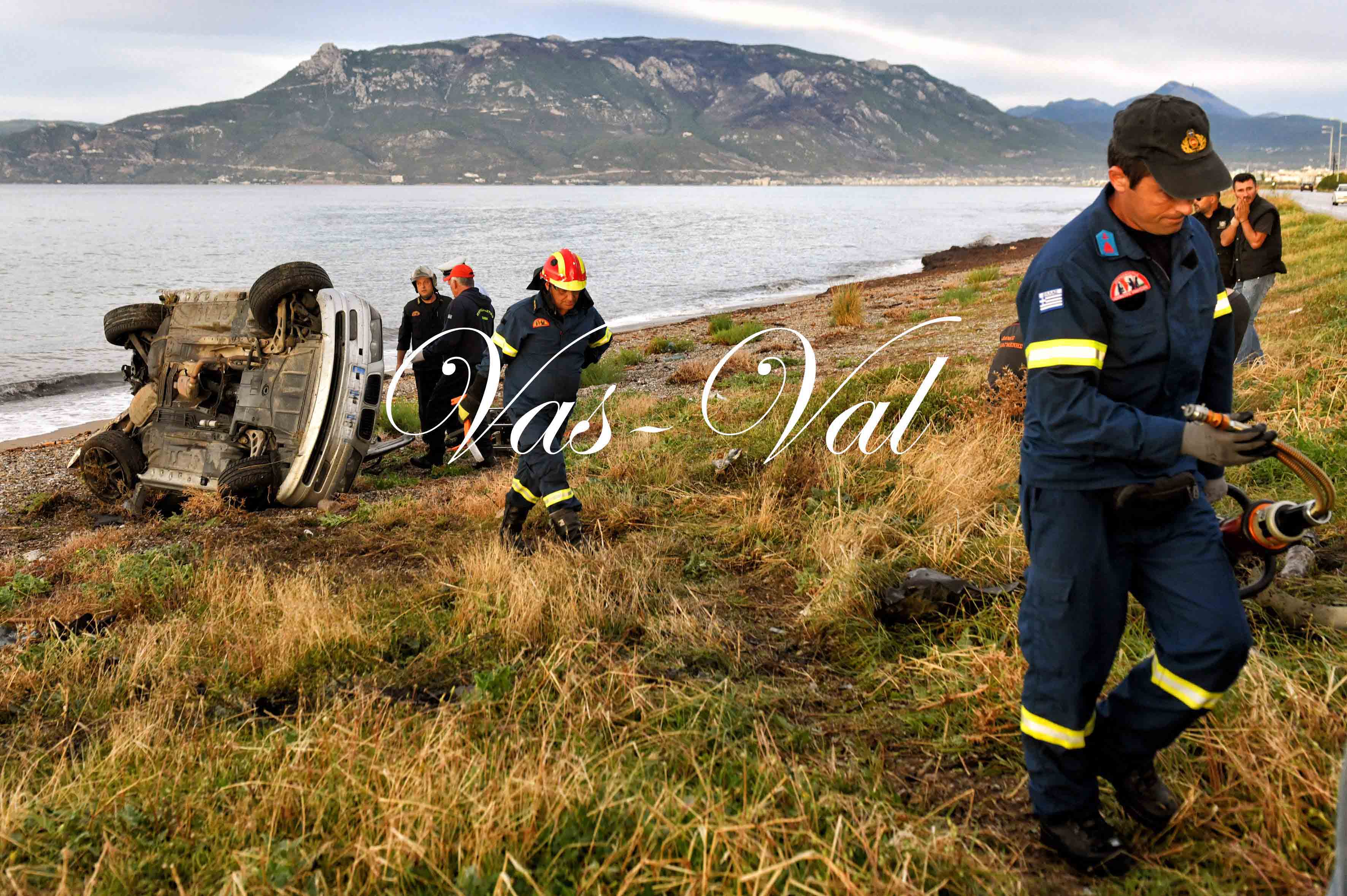 Το όχημα ανετράπη και κατέληξε στην παραλία στο ύψος του Κανταρέ της Κορίνθου στην Παλαιά Εθνική Οδό Κορίνθου – Πατρών.