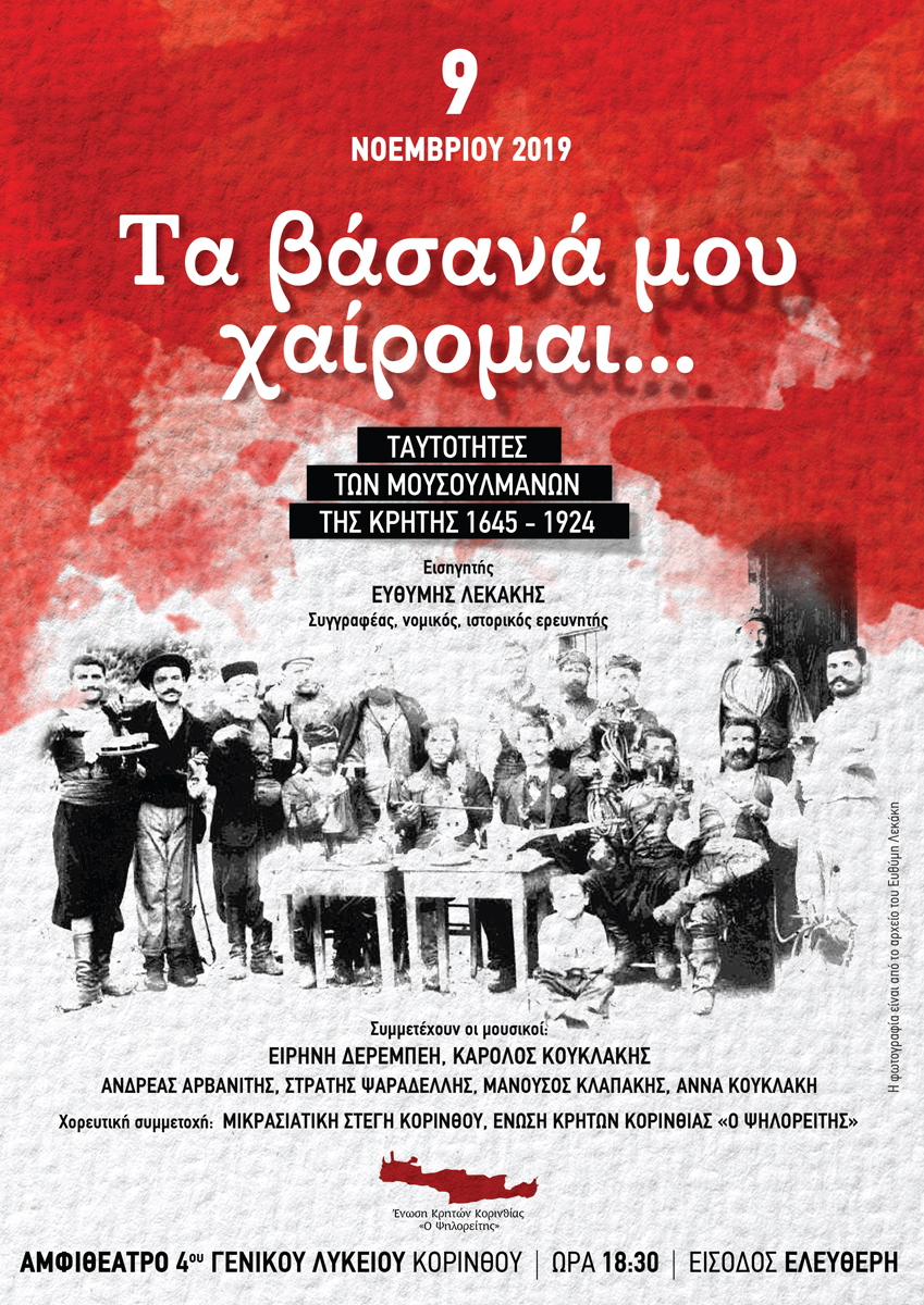 Στα πλαίσια εορτασμού των 70 χρόνων από την ίδρυση του σωματείου μας, Η Ένωση Κρητών Κορινθίας «Ο Ψηλορείτης», συνεπής στην ιστορική έρευνα και τη λαογραφική της προσέγγιση, σας προσκαλεί να γνωρίσετε μια ιστορική πτυχή, άγνωστη στους περισσότερους από εμάς, αυτής των μουσουλμάνων της Κρήτης κατά την περίοδο 1645 – 1924.