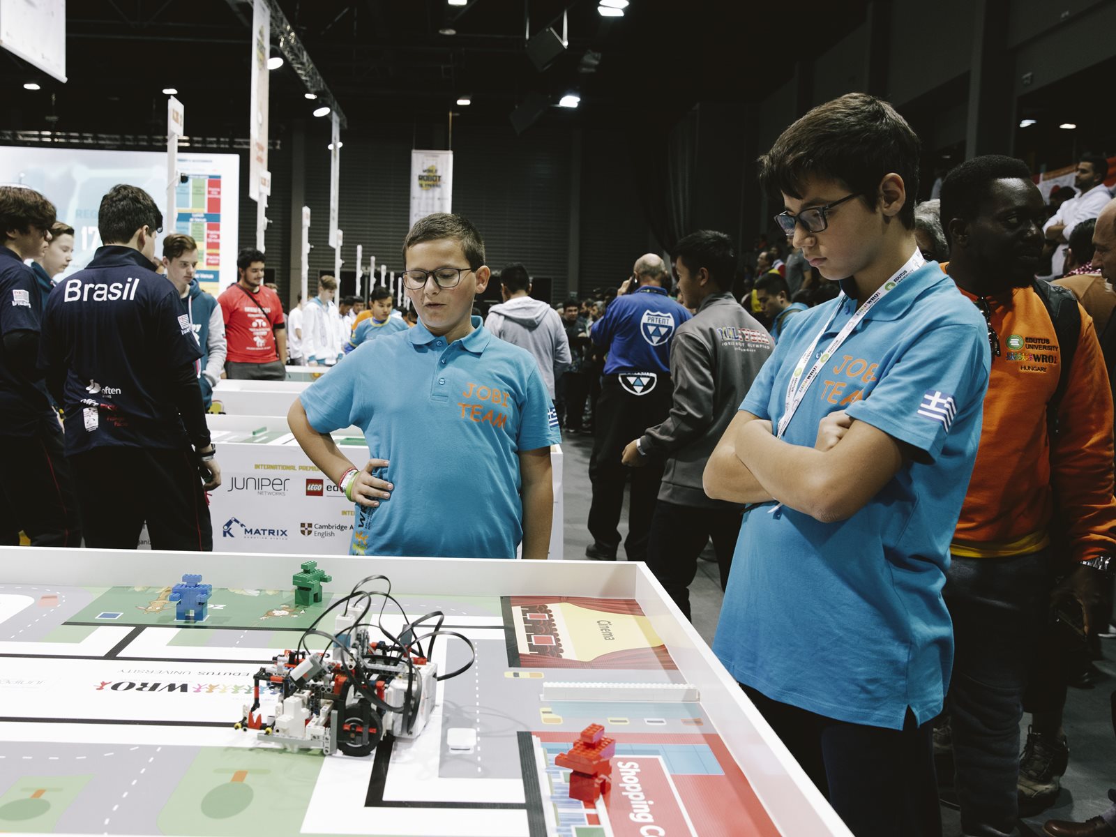 COSMOTE–WRO 2019-2: Η ομάδα Jobi Team με τους Βασίλη Ντάτη και Γιάννη Τριανταφύλλη, επί τω έργω στον παγκόσμιο τελικό της Ολυμπιάδας Εκπαιδευτικής Ρομποτικής 2019 που έλαβε χάλκινο μετάλλιο στην κατηγορία Regular Δημοτικού.