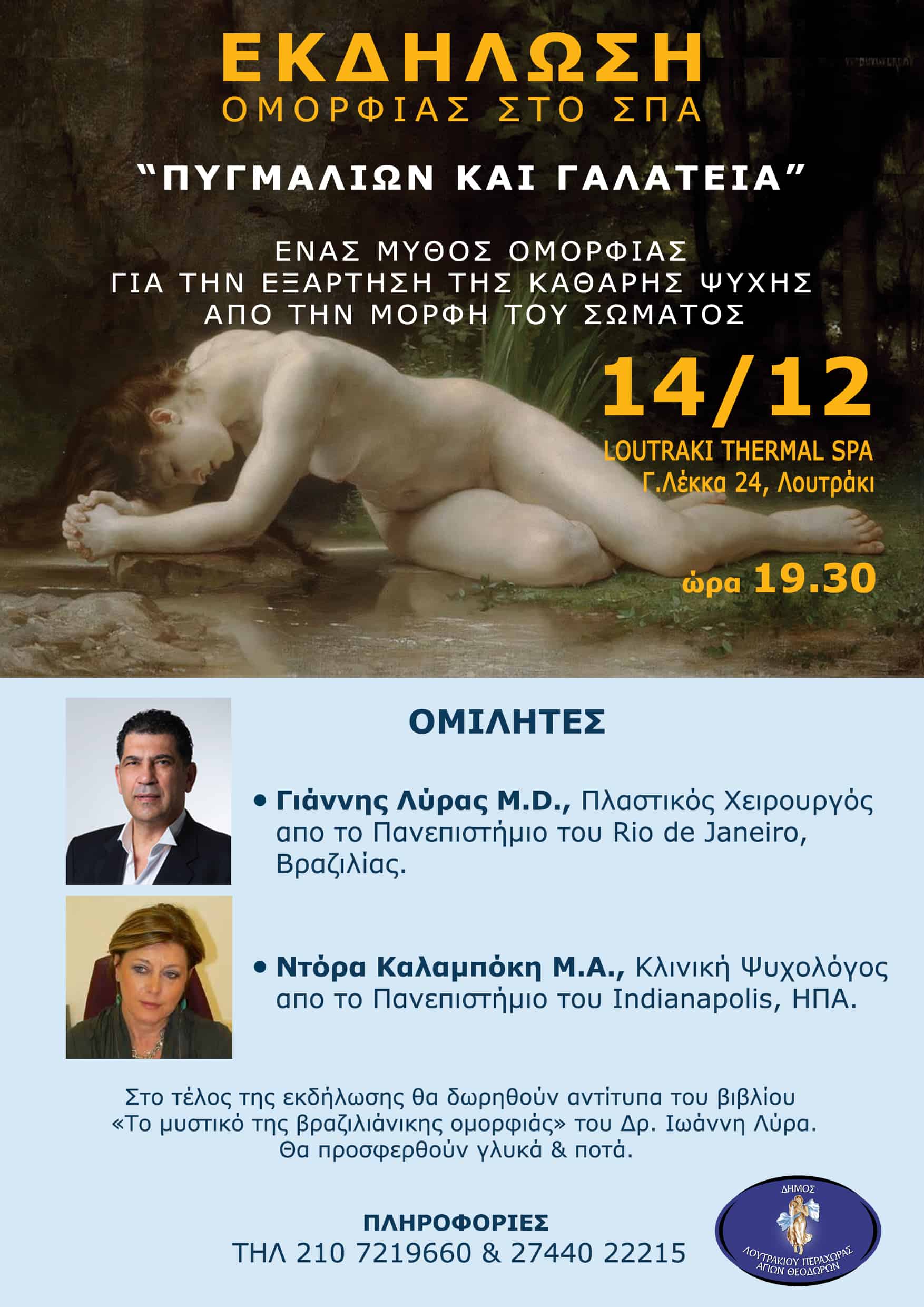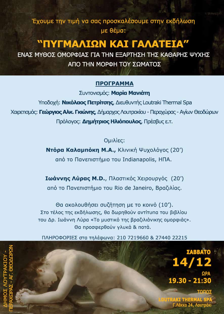 Mια ενδιαφέρουσα εκδήλωση ομορφιάς με θέμα: “ΠΥΓΜΑΛΙΩΝ ΚΑΙ ΓΑΛΑΤΕΙΑ” ΕΝΑΣ ΜΥΘΟΣ ΟΜΟΡΦΙΑΣ ΓΙΑ ΤΗΝ ΕΞΑΡΤΗΣΗ ΤΗΣ ΚΑΘΑΡΗΣ ΨΥΧΗΣ ΑΠΟ ΤΗΝ ΜΟΡΦΗ ΤΟΥ ΣΩΜΑΤΟΣ”, θα πραγματοποιηθεί στο Υδροθεραπευτήριο Λουτρακίου στις 14 Δεκεμβρίου 2019, ημέρα Σάββατο και ώρα 7.30 μ.μ.