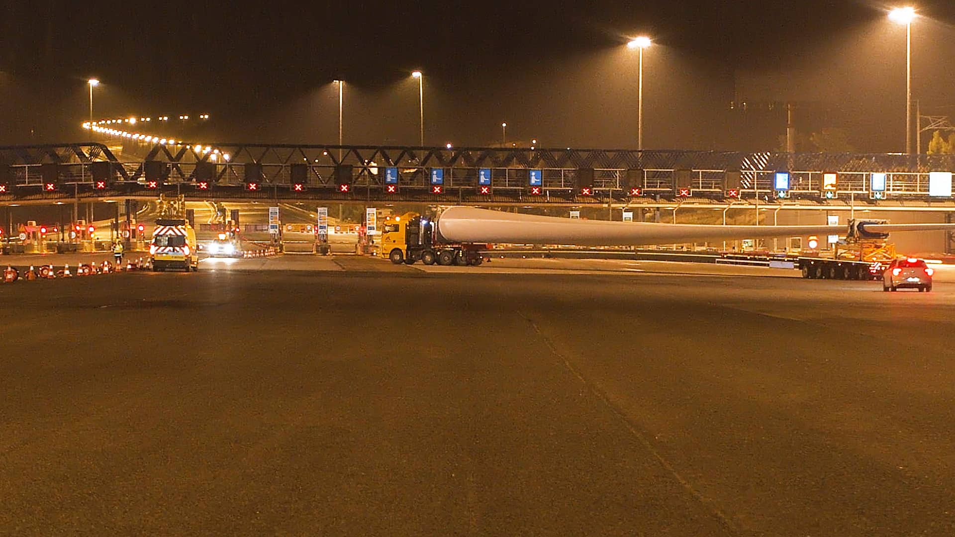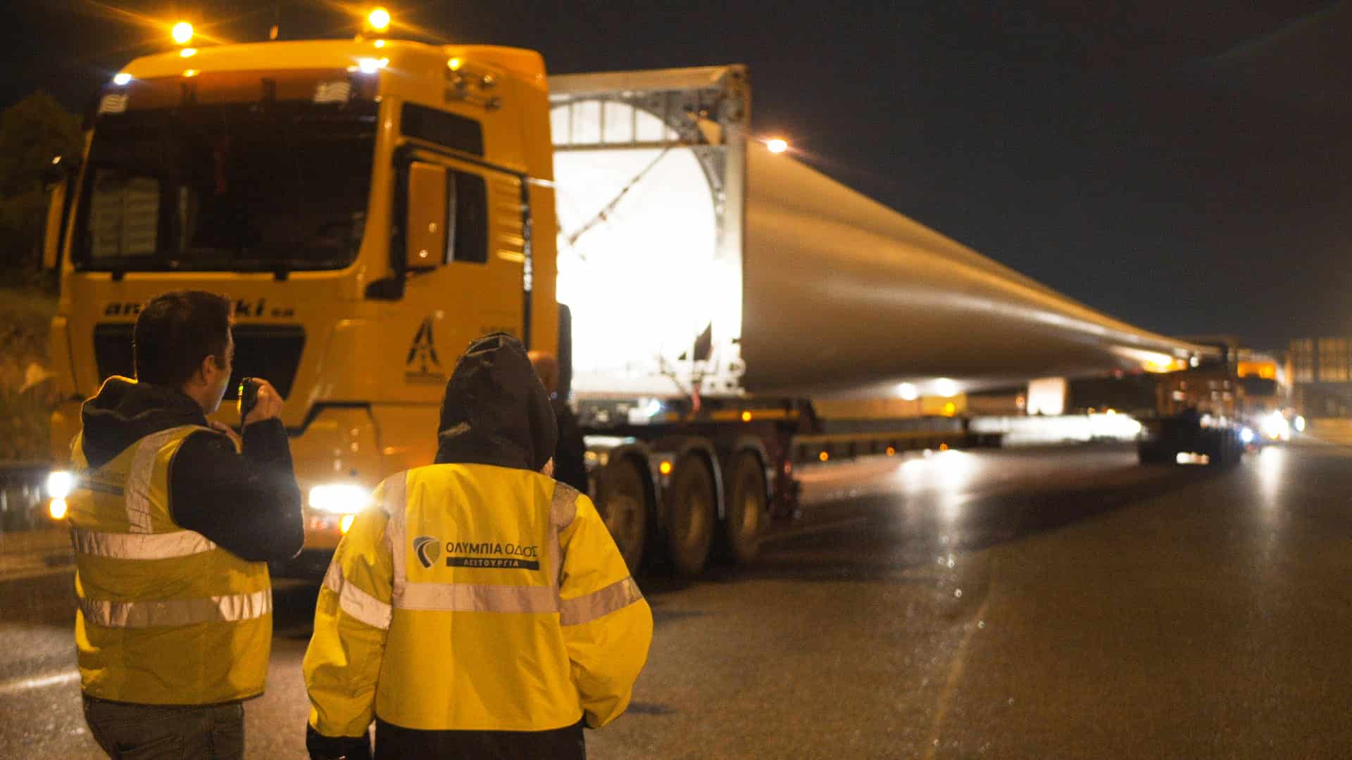 Συγκεκριμένα, περί τις 04.00 τα ξημερώματα της Τρίτης 10 Δεκεμβρίου 2019 ολοκληρώθηκε με επιτυχία η αναστροφή των δύο πρώτων υπερμεγεθών οχημάτων μεταφοράς πτερυγίων ανεμογεννήτριας, μήκους 75 μέτρων έκαστο, στην περιοχή των διοδίων Ελευσίνας.