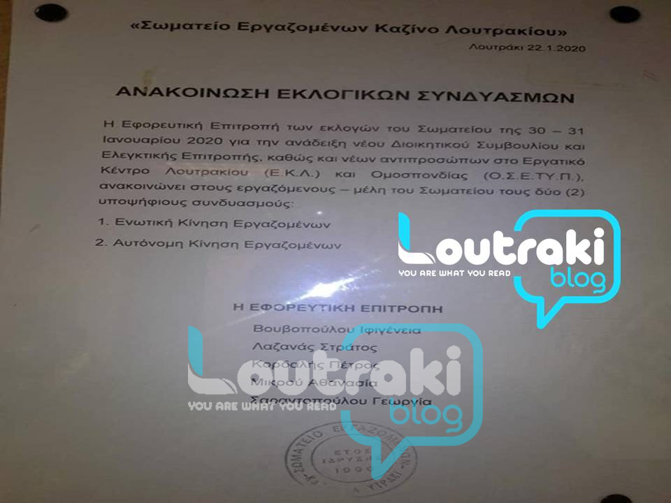 Στις 30-31 Ιανουαρίου οι εργαζόμενοι στο Καζίνο Λουτρακίου ψηφίζουν για το νέο ΔΣ του Σωματείου τους, νέους αντιπροσώπους στο Εργατικό Κέντρο Λουτρακίου καθώς και τους αντιπροσώπους στην Ομοσπονδία (ΟΣΕΤΥΠ).