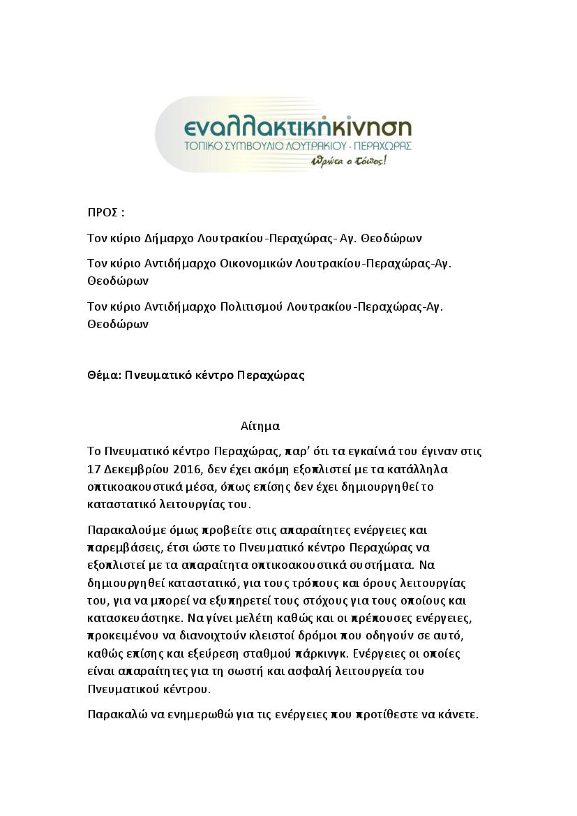 Οι εκπρόσωποι της Εναλλακτική Κίνησης, Τοπικοι σύμβουλοι της Δημοτικής Κοινότητας Λουτρακίου-Περαχώρας, προτείνουν για το Πνευματικό Κέντρο Περαχώρας