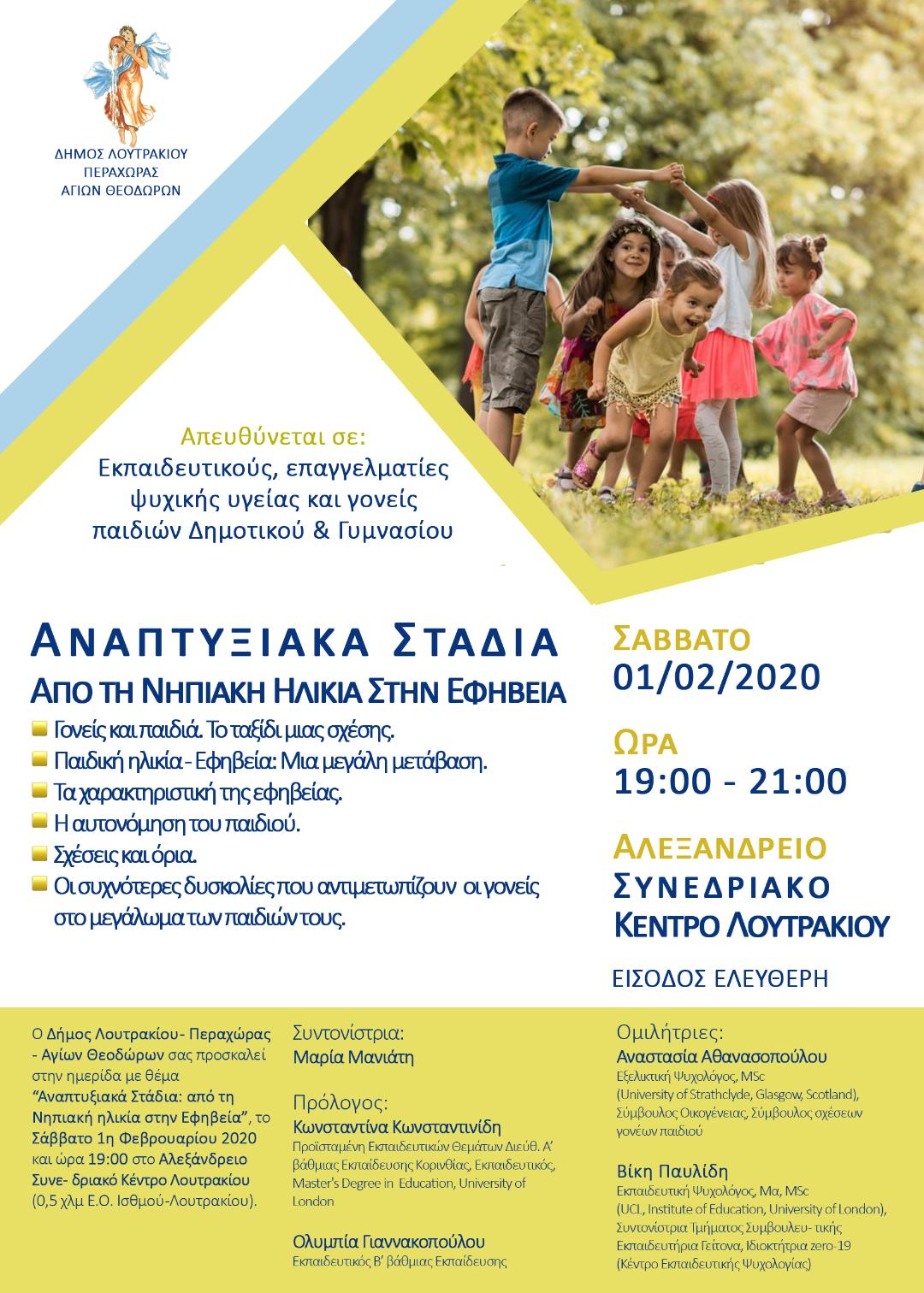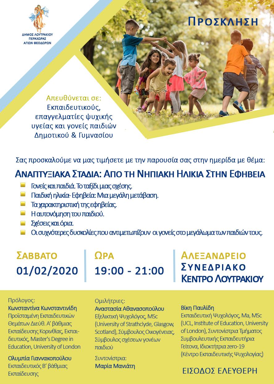 Hμερίδα με θέμα: “Αναπτυξιακά Στάδια: Από τη Νηπιακή Ηλικία Στην Εφηβεία” θα πραγματοποιηθεί το Σάββατο 1η Φεβρουαρίου 2020 και ώρα 19.00 – 21.00 στο Αλεξάνδρειο Συνεδριακό Κέντρο Λουτρακίου.