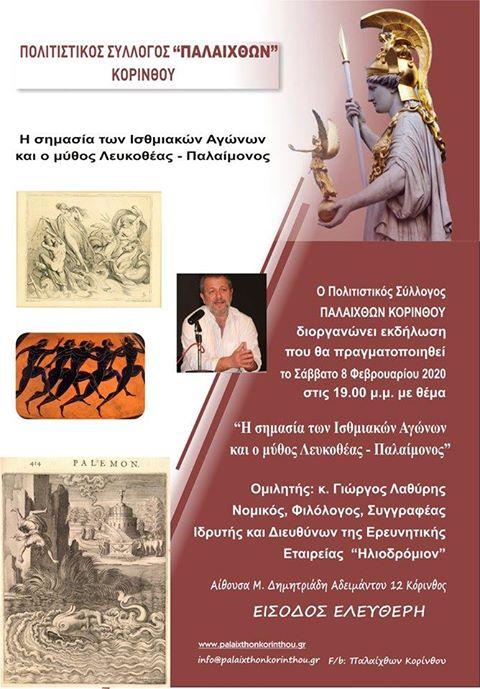 Ο νομικός – φιλόλογος και συγγραφέας κ. Γιώργος Λαθύρης θα μας μιλήσει για την σημασία των Πανελληνίων Αγώνων και ιδιαιτέρως των Ισθμίων, που διεξάγονταν προς τιμήν του Ισθμίου Ποσειδώνος.