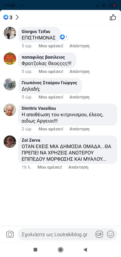 Προσωπικά, δεν περίμενα κάτι διαφορετικό από έναν εκπρόσωπο της ΛΑ.Ε. Μέσα σε μερικές μόνο ημέρες είδαμε το αληθινό πρόσωπο του γιατρού που ευχαρίστως θα τα έπαιρνε γιατί είμαστε ρουφιάνοι. Έχει κάνει το δημοτικό συμβούλιο παλαίστρα, γιατί μισεί θανάσιμα τους Λουτρακιωτες που δεν τον έβγαλαν δήμαρχο. Και η κυρία Μαρία δεν διαφέρει. Θα δημιουργήσουν και στο μέλλον σοβαρά προβλήματα στην δημοτική αρχή, κι ας είναι δημοκρατικά εκλεγμένη.