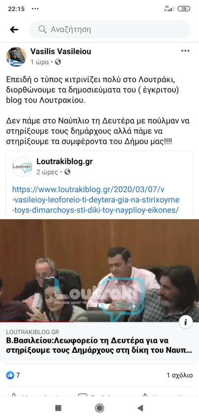 Το loutrakiblοg.gr δημοσιεύει το βίντεο με την τοποθέτηση του Βασίλη Βασιλείου, αυτός παρεξηγείται και γράφει ότι είμαστε “κίτρινος τύπος” . (Πολλοί χρησιμοποίησαν προεκλογικά και μετεκλογικά τον τίτλο αυτό, αλλά τελικά μέχρι σήμερα έχουμε δικαιωθεί περίτρανα για όσα πιστεύουμε, όσα γράφουμε και όσα δημοσιεύουμε)