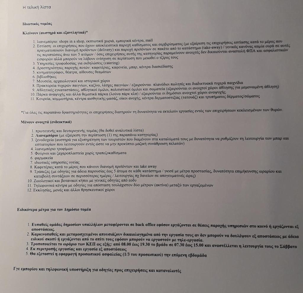 Για την εστίαση που δεν καταργείται το  ντελίβερι, θα πρέπει σε όλα τα μαγαζιά να μην υπάρχουν ουρές άνω των 5 ατομων. Αντίθετα κλείνουν βιβλιοθήκες, πρακτορεία τυχερών παιγνίων ΟΠΑΠ (θα επιτρέπεται μόνο διαδικτυακό στοίχημα), πολιτιστικοί όμιλοι, πολιτιστικά σωματεία, αθλητικοί χώροι και πάρκα αναψυχής. Μένουν ανοιχτοί ζωολογικοί και βοτανικοί κήποι εκτός ίσως από συγκεκριμένα σημεία που συνωστίζεται κόσμος όπως π.χ το Δελφινάριο. Κλείνουν επισης κουρεία, κομμωτήρια, κέντρα αισθητικής, οίκοι ακοχής, καταστηάμτα τατουάζ, μασάζ και περιποίησης νυχιών.