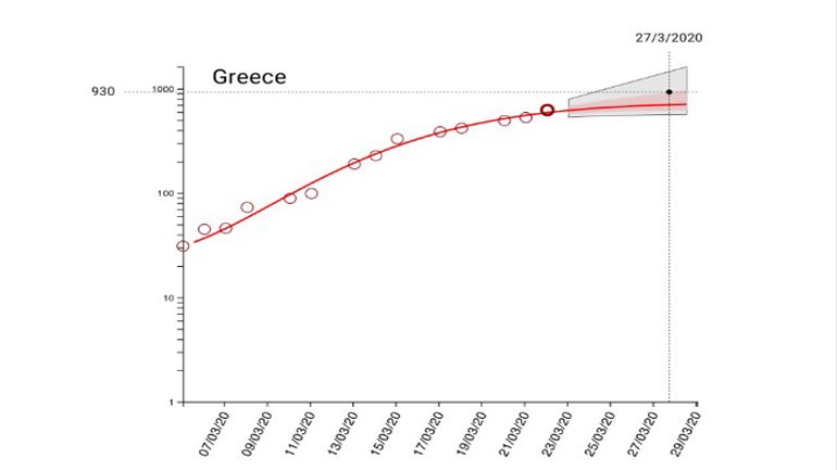 Πολύ ενδιαφέρον παρουσιάζει το μαθηματικό μοντέλο, που έχουν αναπτύξει Γερμανοί επιστήμονες για να προβλέψουν την πορεία των επιβεβαιωμένων κρουσμάτων σε διάφορες χώρες. Για την Ελλάδα, προβλέπεται ήπια αύξηση των κρουσμάτων, που σε ακραία περίπτωση μπορεί να φθάσουν τα 930 μέχρι το Σάββατο.