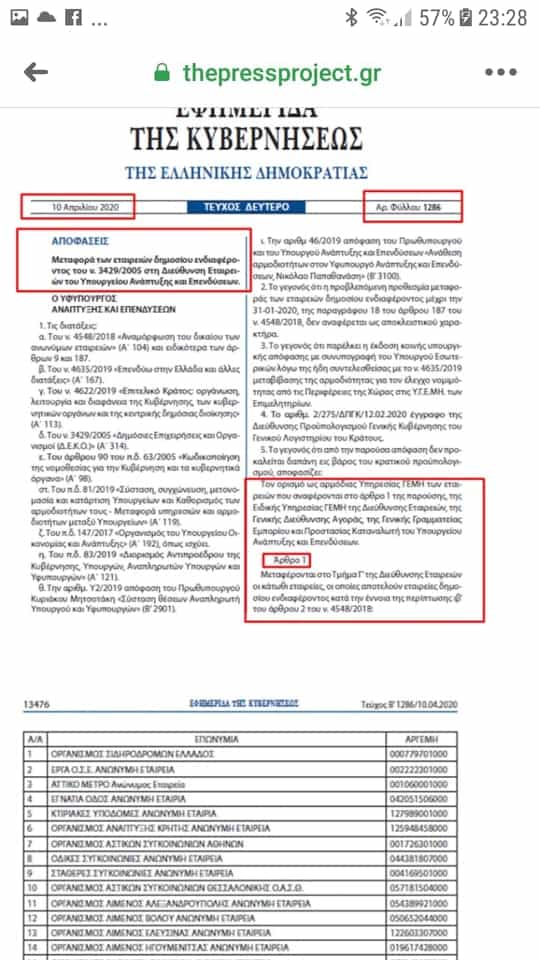 Σύμφωνα με το ΦΕΚ (Β’ 1286/10-04-2020), που ήρθε στη δημοσιότητα από την ΠΟΣΠΕΡΤ, με απόφαση του υφυπουργού Ανάπτυξης Ν. Παπαθανάση, μεταφέρονται οι εταιρείες του Δημοσίου, ΕΡΤ Α.Ε. ΕΡΤ net A.E. και το Αθηναϊκό Πρακτορείο Ειδήσεων στο τμήμα Γ’ της Διεύθυνσης Εταιρειών του Υπουργείου Ανάπτυξης και επενδύσεων, κατά την έννοια του Αρ.2 του Νόμου 4548/2018.