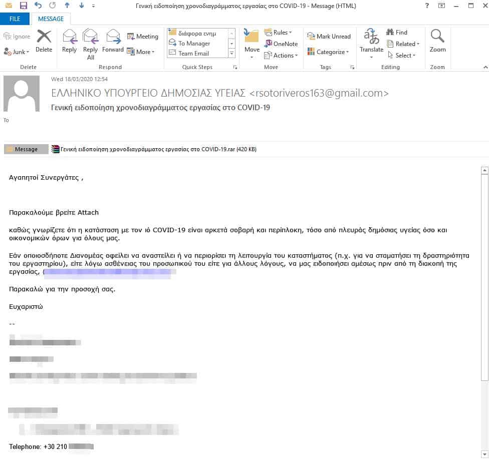 Τις τελευταίες ημέρες αρκετές επιχειρήσεις και ιδιώτες έχουν λάβει, μέσω του ηλεκτρονικού τους ταχυδρομείου, ένα μήνυμα με παραπλανητικό τίτλο και περιεχόμενο. Το μήνυμα, που προσπαθεί να επωφεληθεί της παρούσας κατάστασης με τον νέο κορωνοϊό έχει θέμα: “Γενική ειδοποίηση χρονοδιαγράμματος εργασίας στο COVID-19”
