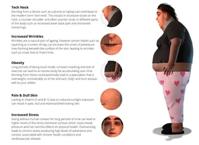 Η Σούζαν, λοιπόν, όπως ονομάζεται το μοντέλο, δεν προκαλεί έκπληξη που έχει κακή στάση σώματος, οπτικό σύνδρομο υπολογιστών, μαύρους κύκλους, περισσότερες ρυτίδες από τον μέσο όρο, είναι υπέρβαρη, έχει τριχόπτωση ενώ αυτό που δεν φαίνεται είναι ότι νοσεί ψυχολογικά λόγω της έλλειψης ανθρώπινης επαφής και του άγχους, που μπορεί να οδηγήσει σε αυξημένη αρτηριακή πίεση, η οποία με τη σειρά της προκαλεί χρόνια προβλήματα υγείας όπως καρδιαγγειακές παθήσεις.