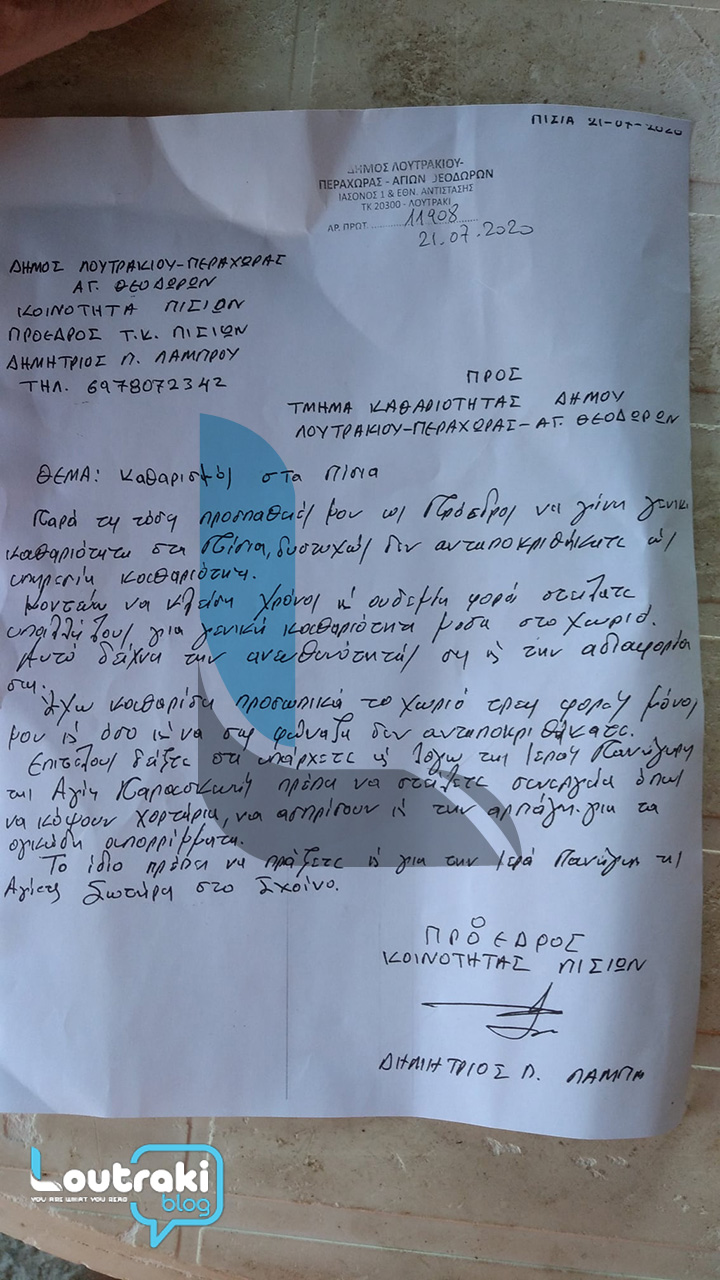 Ως απάντηση δημοσιεύσεων σε μέσα κοινωνικής δικτύωσης του πρώην προέδρου κ. Γκίκα Ιωάννη του Μηνά για τον καθαρισμό στα Πίσια , του παραθέτω το παρακάτω έγγραφο με α.π. 11908 / 21-07-2020 το οποίο αναλύει τις ενέργειες του Προέδρου Δημητρίου Π. Λάμπρου.