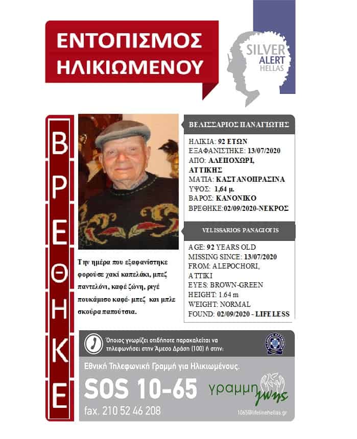 Ο 92χρονος, είχε εξαφανισθεί την 13/07/2020, από το εξοχικό του στο Αλεποχώρι, Αττικής. Έκτοτε δεν είχε δώσει σημεία ζωής. Η υπηρεσία Silver Alert, μετά από αίτημα των συγγενών και αφού συγκέντρωσε τα απαραίτητα δικαιολογητικά, ενεργοποίησε τον κοινωνικό συναγερμό SILVER ALERT, για την κινητοποίηση όλων με στόχο την ανεύρεσή του.
