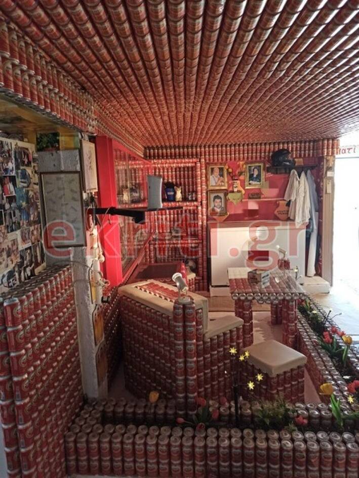 Τοίχοι και οροφή έχουν επικαλυφθεί. Πολυθρόνα, τραπεζάκι, ράφια, παρτέρι με λουλούδια, όλα κατασκευασμένα με κουτάκια αλουμινίου.