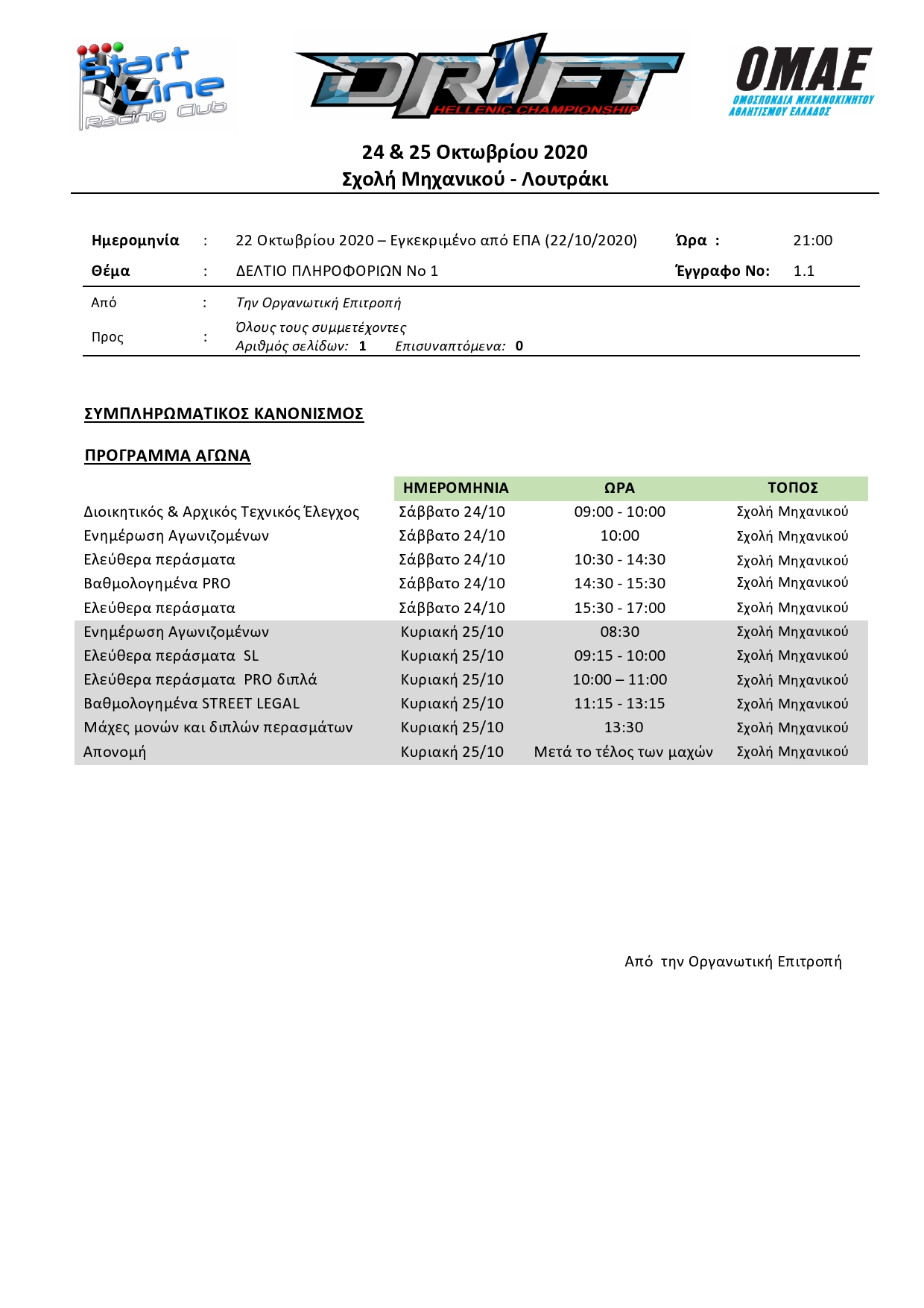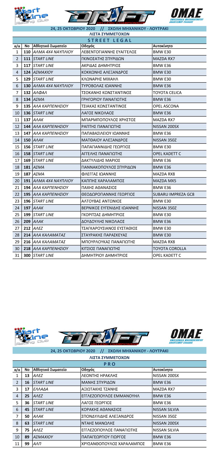 Το Αθλητικό Σωματείο START LINE μετά από έγκριση της ΟΜΑΕ – ΕΠΑ οργανώνει τον 5o αγώνα Πανελληνίου Πρωταθλήματος DriftPRO και τον 5ο αγώνα Κυπέλλου STREET LEGAL που θα διεξαχθεί το Σάββατο 24 και την Κυριακή 25 Οκτωβρίου 2020, στη Σχολή Μηχανικού στο Λουτράκι. Ο αγώνας θα γίνει σύμφωνα με τις διατάξεις: