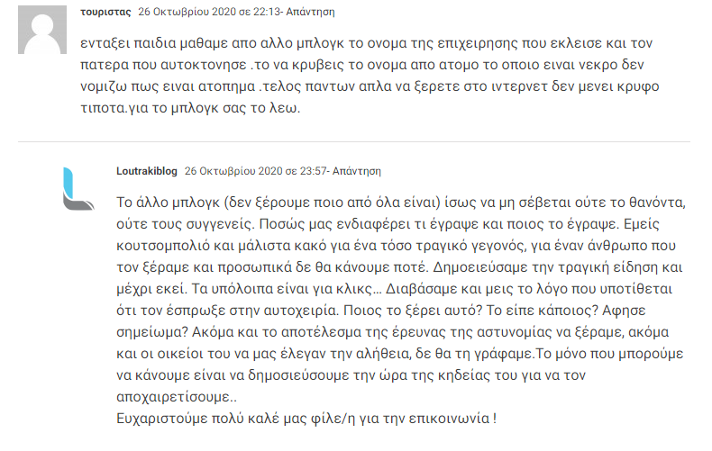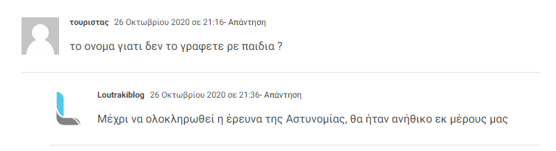 Ξεκαθαρίζουμε ότι το loutrakiblog.gr ουδέποτε μπήκε στη λογική των κλικς. Πάντα σεβόμαστε τον αναγνώστη και πάντα τις οικογένειες. Δεν πρόκειται να απολογηθούμε για άλλους που στη λογική αυτή δημοσιεύουν αυτά που δημοσιεύουν κατά καιρούς, είτε για την πόλη, είτε για συμπολίτες, είτε για οτιδήποτε άλλο.
