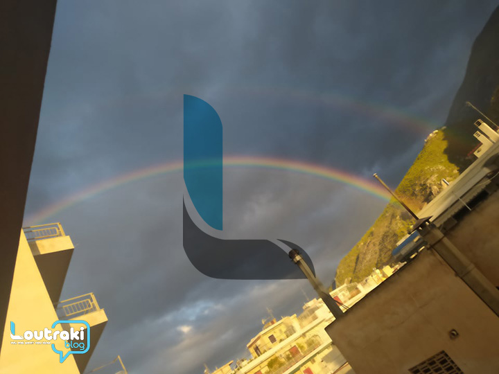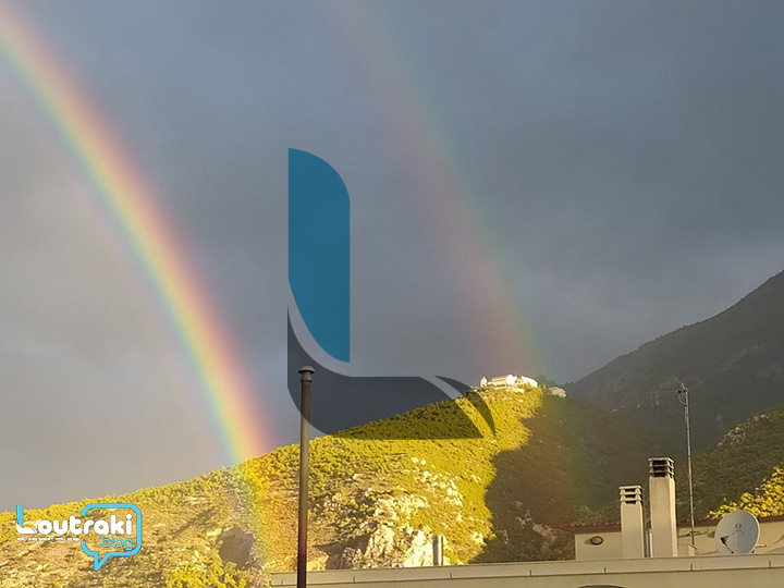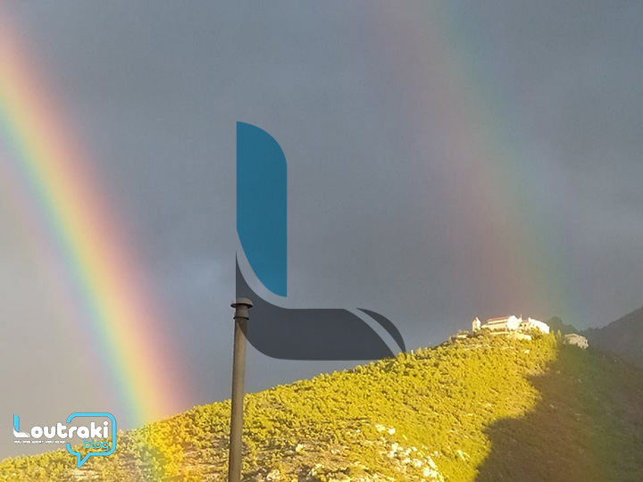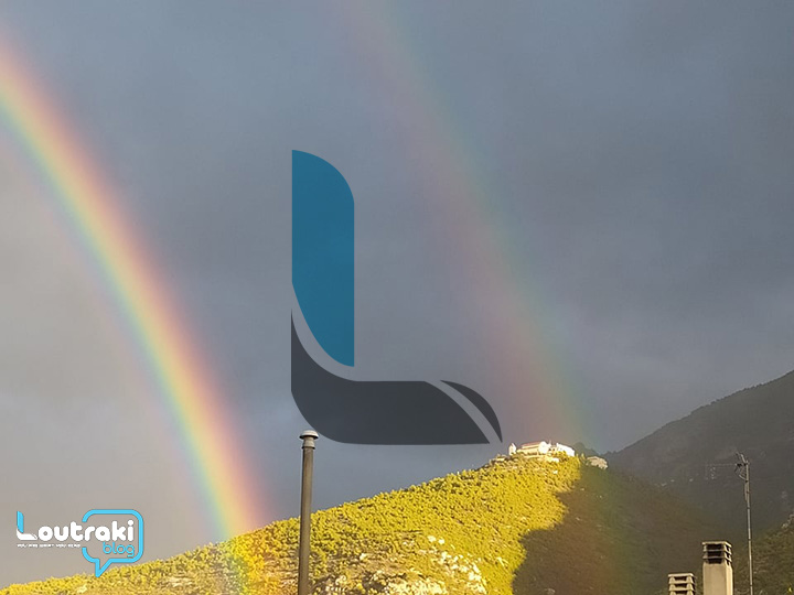 Tα δύο ουράνια τόξα ξεπρόβαλλαν μέσα από τις σταγόνες της βροχής που άρχισαν να πέφτουν στο Λουτράκι, λίγα μόνο λεπτά μετά την εξαφάνισή των δύο ουράνιων τόξων.