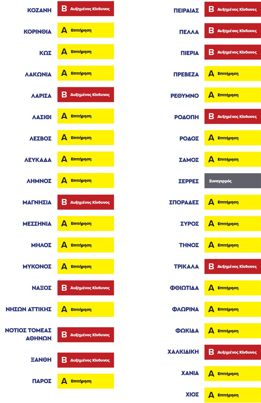 Στο «κίτρινο» – επιτήρησης οι: Φλώρινα, Γρεβενά, Θεσπρωτία, Πρέβεζα, Αρτα, Αιτωλοακαρνανία, Καρπενήσι, Καρδίτσα, Φθιώτιδα, Φωκίδα, Εύβοια, όλη η Πελοπόννησος, η Κρήτη τα νησία Ιονίου και τα υπόλοιπα νησιά Αιγαίου